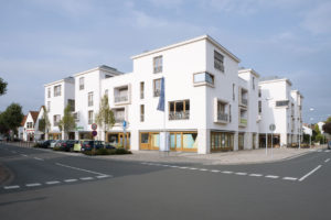 „Neue Stadtmitte Eschborn“: Harmonisch fügt sich das Gebäude-Ensemble in den Stadtkern ein, in unmittelbarer Nähe zum Rathaus der 20.000-Einwohner-Gemeinde. Die Gebäude sind wie die für Hessen typischen Hofreiten angelegt und bieten so neben den Geschäften, Büros und Wohnungen auch einen zentralen, öffentlichen Platz.