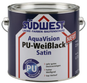 Leicht zu streichen, hohe Strapazierfähigkeit und hohe Deckkraft, vergilbungsfrei: Die neuen AquaVision Lacke von Südwest (PU-Weißlack und Vorlack) vereinen hohe technische Qualität mit optimalen Verarbeitungseigenschaften. Beide Lacke basieren auf der innovativen PU-Hybrid-Technologie, die sowohl Polyurethan als auch Acrylate als Bindemittel einsetzt.
