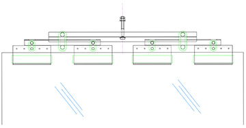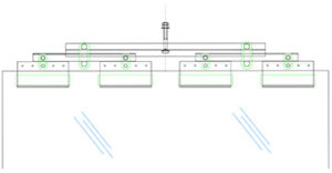 Die Konstruktionsskizze veranschaulicht die Realisierung der Glasfassade als „hängende Fassade“: Scheibe von vorne, die grünen Rechtecke stehen für die verklebten Glasklötze. Je Scheibe sind acht Klötze aufgeklebt (vier vorne; vier auf der Rückseite). Die Klötze werden von Metallkrallen von oben gegriffen.