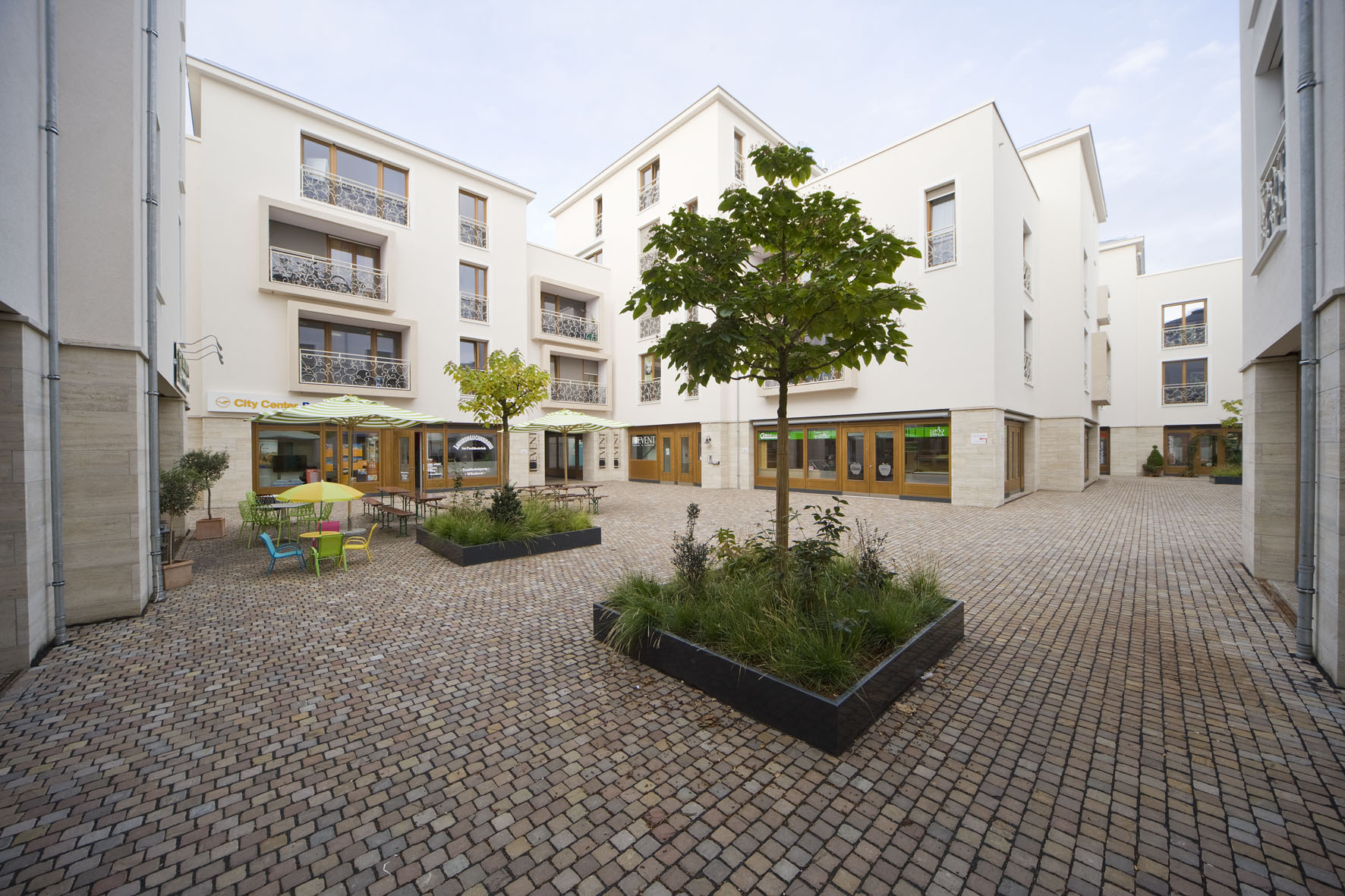 Ein Innenhof, wie er gerade in Hessen von den Hofreiten seit alters her bekannt ist: Die „neue Mitte Eschborn“ ist ein Wohn- und Geschäftshaus, dessen Mittelpunkt als öffentlicher, zentraler Platz dient.