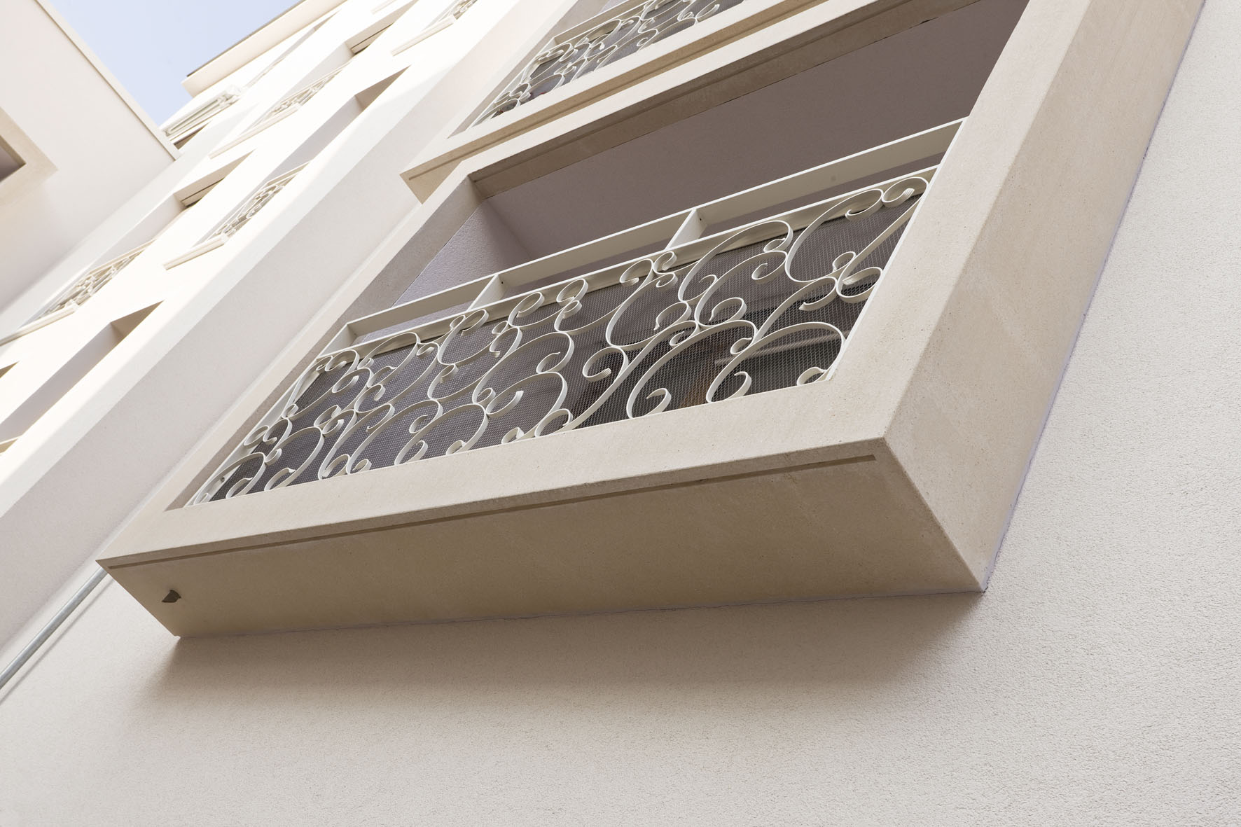 Auskragende Loggien mit Rahmen aus massiven Sto-Fassadenprofilen gliedern die Fassade. Die Ecken der Häuser sind mit Natursteinen verkleidet, die Gestaltung erinnert an die mediterrane Architektur Spaniens.