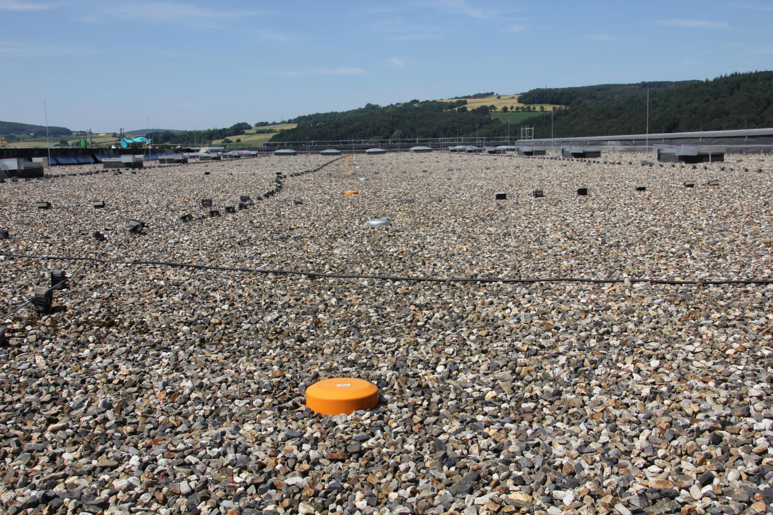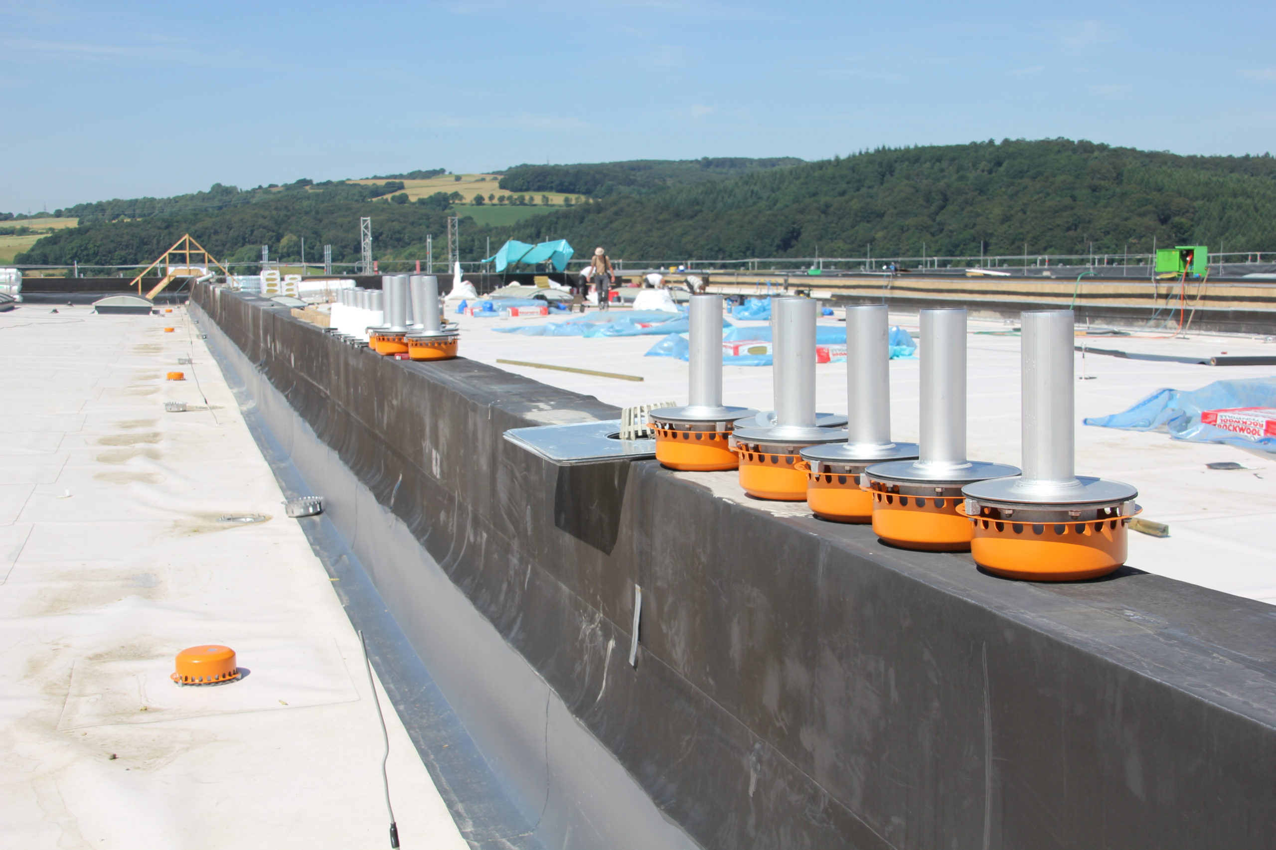 Insgesamt wurden auf einer Dachfläche von rund 7.800 Quadratmetern 96 Drainjet-Abläufe (DN 70) verbaut. Haupt- und Not-Entwässerung lassen sich einfach unterscheiden, da die Wehre der Notentwässerung mit oranger Haube einfach zu erkennen sind, die Abläufe der Hauptentwässerung sind silberfarben.