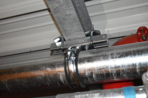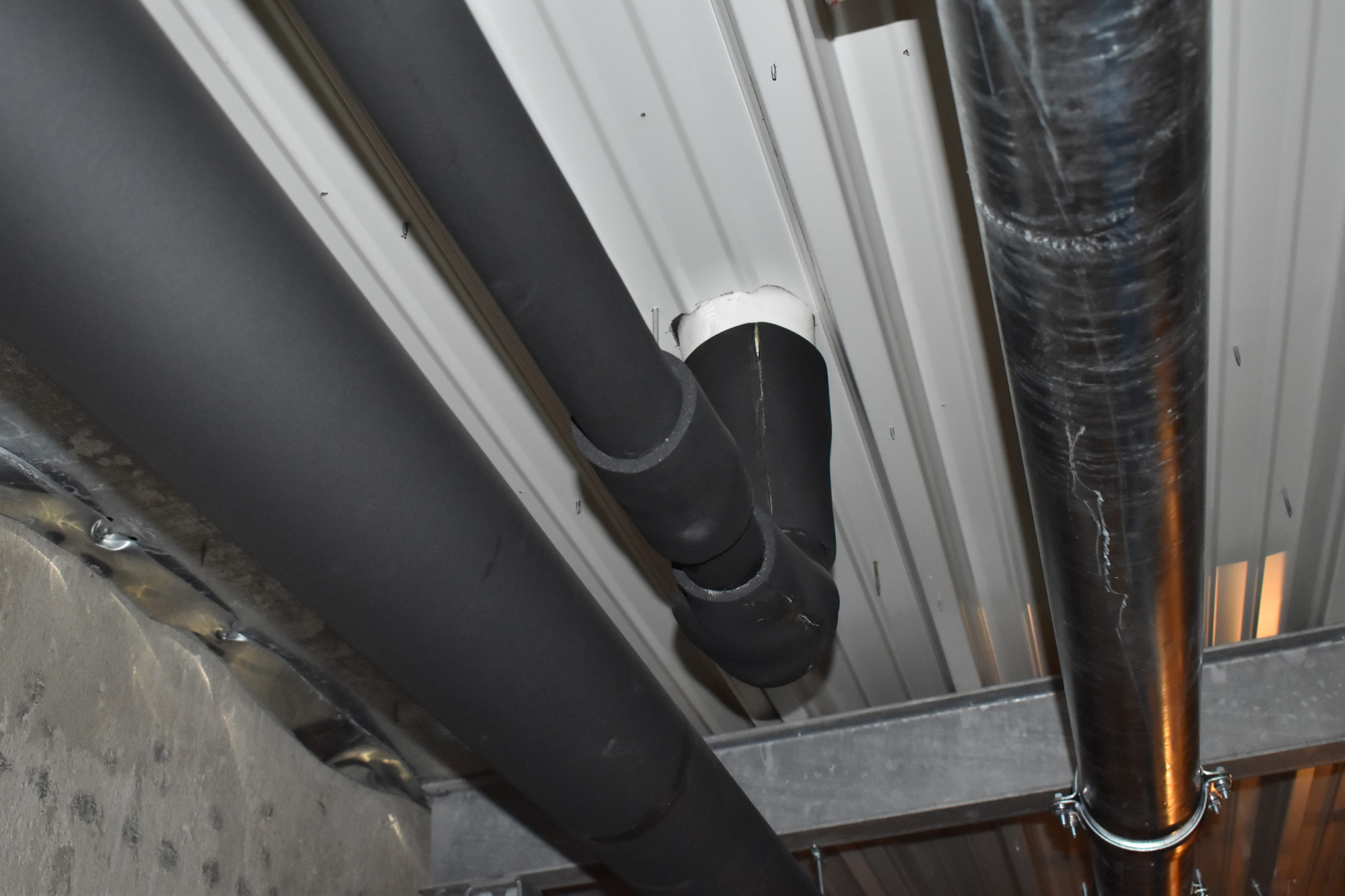 Die Dämmung der Rohre verhindert Kondensat und schützt so die Produkte vor Feuchteschäden. Gedämmt wurde individuell vor Ort. Links die bereits gedämmte Haupt-Entwässerung, rechts die noch ungedämmte Not-Entwässerung.