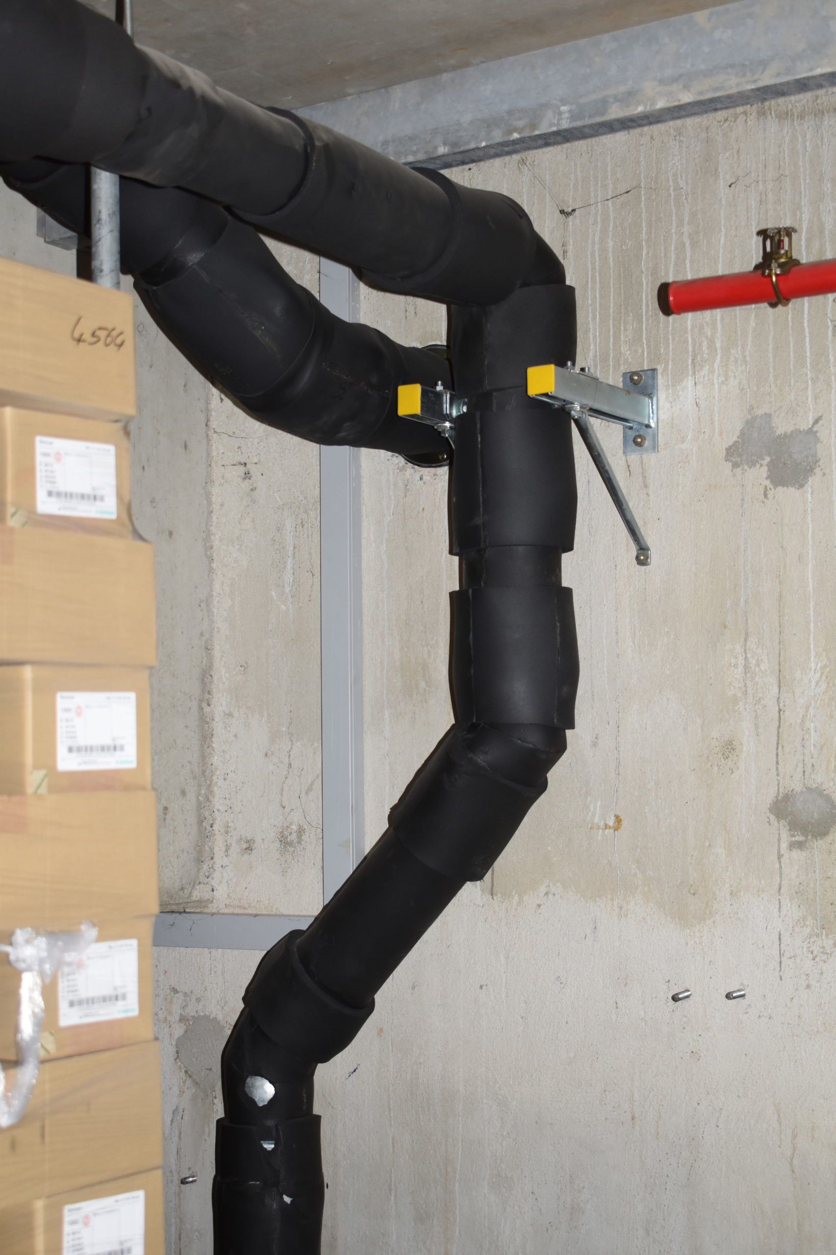 Um Kondensat an den Rohren zu verhindern, wurden die Stränge bauseits vollständig gedämmt. Durch die komplexen Formen der Rohre ist das Dämmen echte Handarbeit: Nach der Installation der Rohre bekamen die Stränge und alle Abzweige vor Ort eine Dämmung aus synthetischem Kautschuk.
