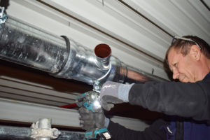 Die insgesamt 96 Drainjet-Abläufe (DN 70) werden in nur acht Strängen über Sammelleitungen gebündelt. Dafür führen die Stränge über die gesamte Hallenlänge. Gut zu erkennen ist der Abzweig, der dann an einen Ablauf angeschlossen wird.