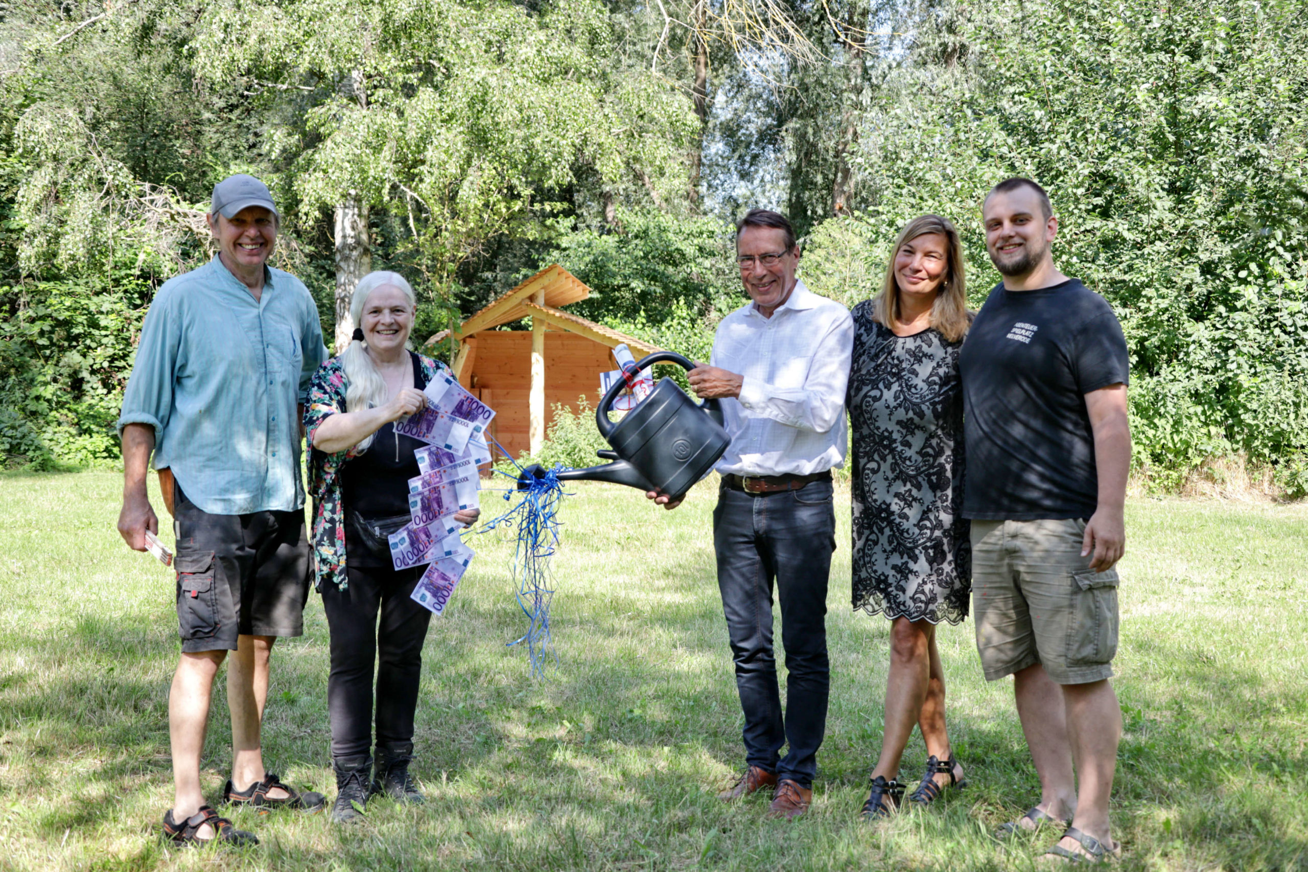 Evelyn Simson (2. v.l.), ehemalige Leiterin des Abenteuerspielplatz Melverode, und Andreas Hartmann (Mitte), als Geschäftsführer der Stadtentwässerung Braunschweig GmbH schon seit Jahren auch Pate der Veolia Stiftung bei Projekten auf dem Spielplatz, bei der symbolischen Übergabe der 8.000-Euro-Spende. Mit dem Geld wurde das neue Badehaus auf dem Spielplatz gebaut. Zur Übergabe kamen auch Fabian Wilke (rechts) aus dem Team des Abenteuerspielplatzes, Ina Patricia Rieger, die für die SE|BS umweltpädagogische Projekte betreut, und links Ottfried Gast, der in vielen ehrenamtlichen Stunden das Projekt geplant und bei der Realisierung mitgewirkt hat.
