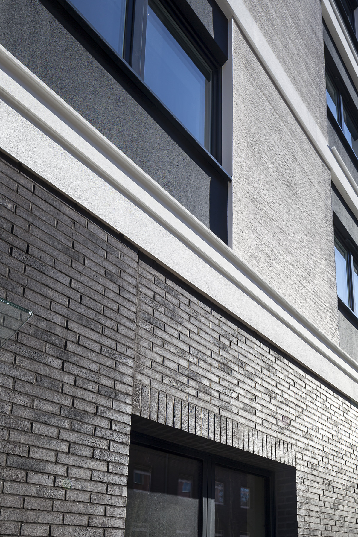 … während in den Obergeschossen massive Gurtgesimse aus Verolith, helle besengestrichene Putzfelder und dunkle gefilzte Putzflächen die Fassade gliedern.
