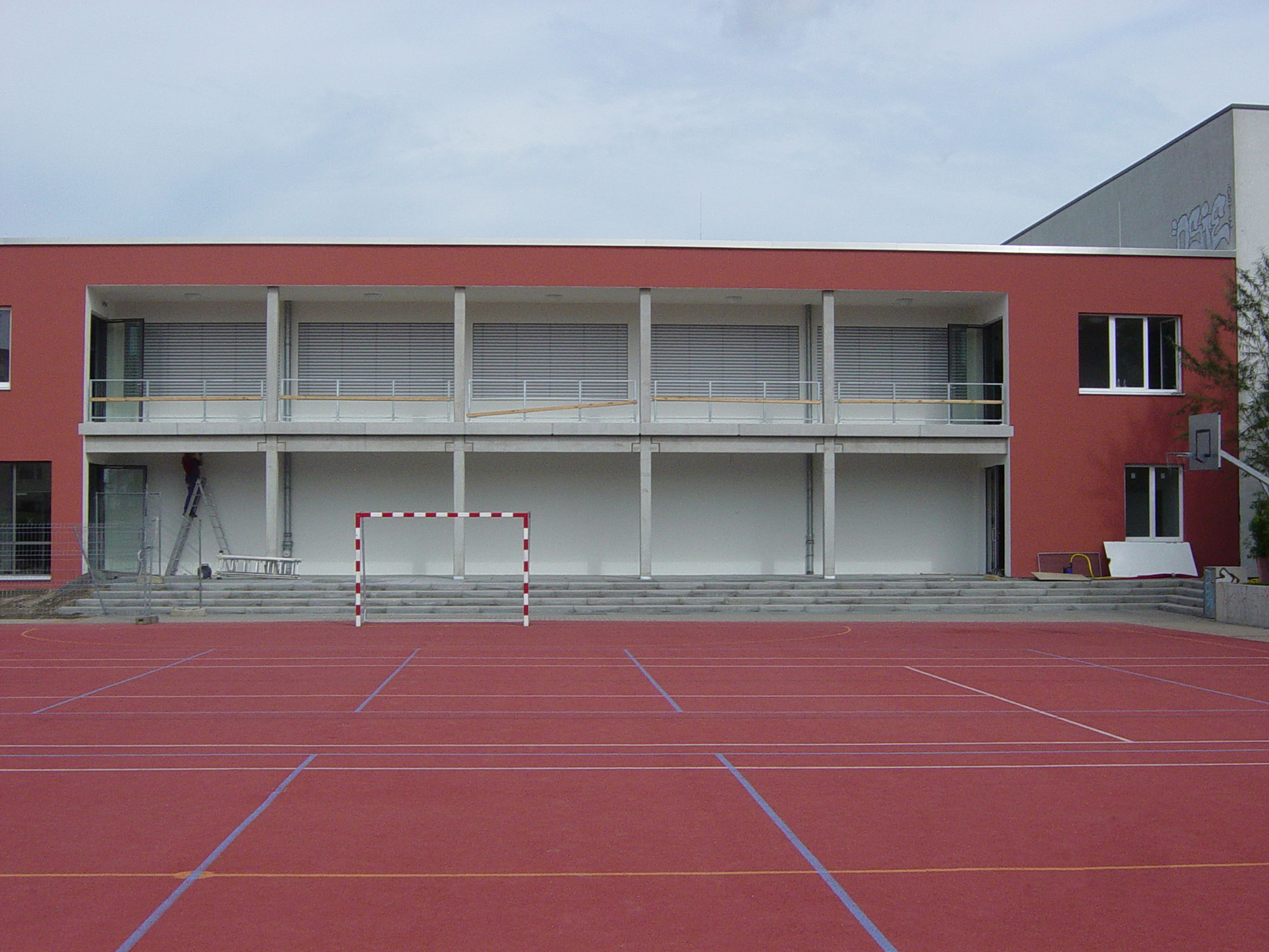 Mit der neuen Gefälleplanung und einer einzigen U-förmigen Tiefpunktlinie wurden gleich mehrere Wünsche erfüllt: Der Arbeitsaufwand ging erheblich zurück – statt 14 waren nur noch zwei Abläufe einzubauen. Diese Abläufe liegen jetzt direkt über der Fallleitung, damit entfallen auch die horizontalen Sammelleitungen im Gebäude. Die ursprüngliche Position des Anschlusses der Fallleitung an die Regenwassersammelbehälter im Erdreich wurde dennoch beibehalten. Weil jetzt die witterungsbeständige, bruchfeste, rückstausichere und optisch ansprechende Fallleitung aus verzinktem Stahl zudem außen (am Vorbau) liegt, ist auch der Wunsch erfüllt, dass keine Leitung durch das Gebäude führt. Dadurch ist es in der Schule ruhiger. Weil keine Durchbrüche durch das Dach mehr vorhanden sind, ist zudem der Brandschutz einfacher.