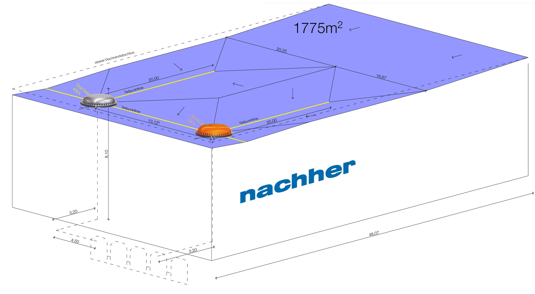 Gemeinsam mit dem verantwortlichen Planer wurde als Ziel gesetzt, die Zahl der Abläufe und Dachdurchführungen zu verringern, die Verlegung der Rohre zu vereinfachen und die Rohre – wenn möglich – nach außen zu verlegen. Die Herausforderung lag insbesondere darin, die beiden Teilflächen zu einer gemeinsamen Tiefpunktlinie für das gesamte Dach zusammen zu bringen, um so die Anzahl der notwendigen Entwässerungspunkte zu minimieren. Bei diesen Planungen ist die Zusammenarbeit mit dem Hersteller der Gefälledämmung anzuraten.