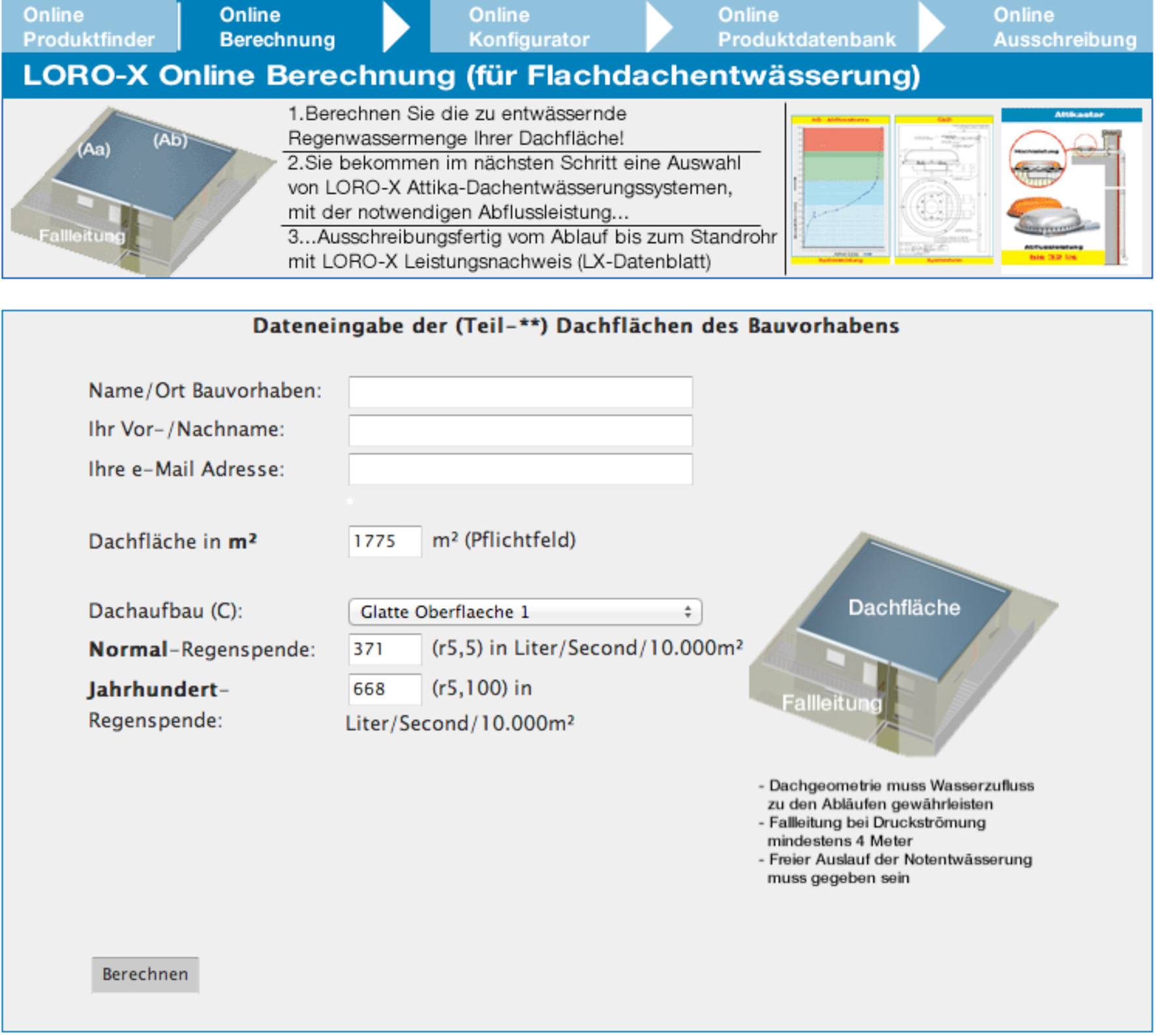 Online-Tool zur Berechnung der notwendigen Flachdach-Abläufe.