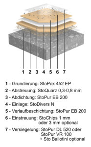 Trittschall reduziert das System um 12 Dezibel. So leistet es einen positiven Beitrag zum Schallschutz im Hochbau (DIN 4109). Die Versiegelungen StoPur DL 520 oder StoPur VR 100 (gefüllt mit Sto Ballotini) sorgen zusätzlich für leichtes Reinigen der Böden und sicheres Begehen selbst bei Nässe.