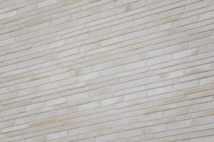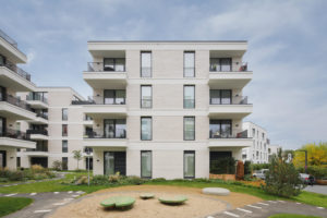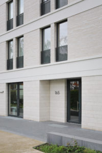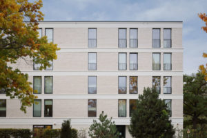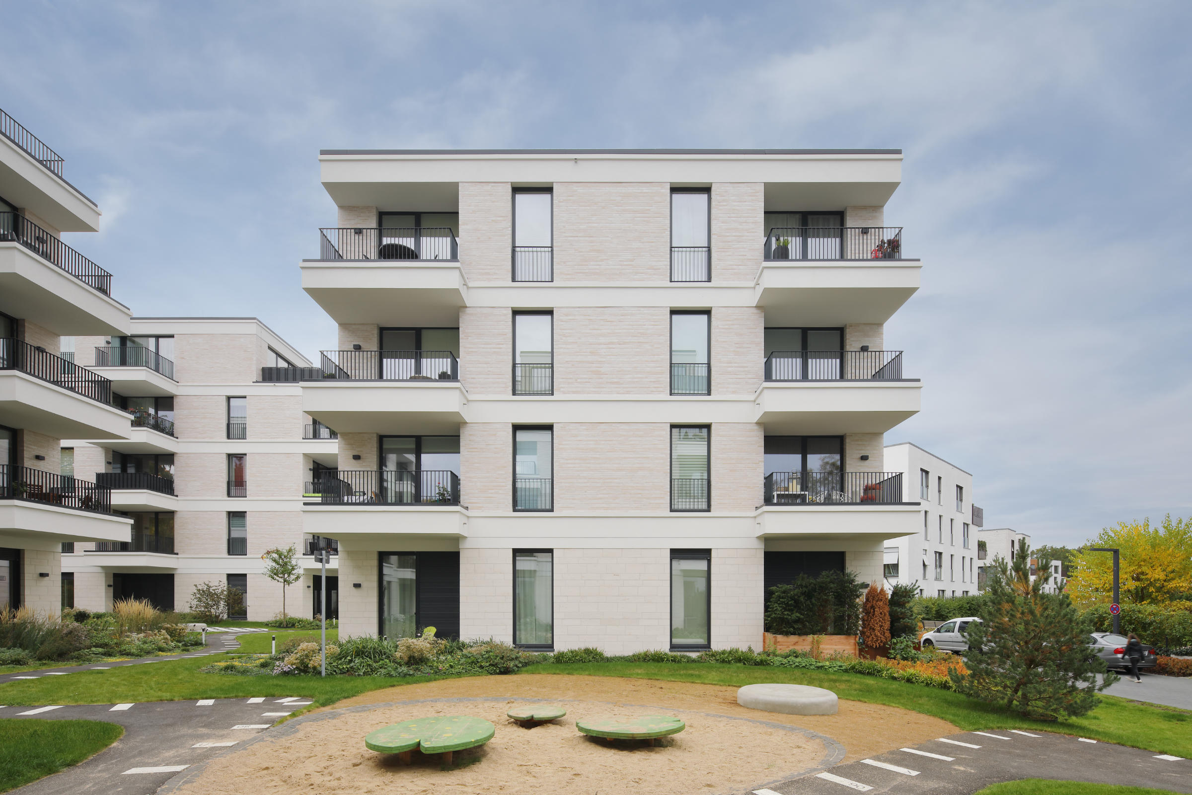 Insgesamt entstanden hier 79 Wohneinheiten auf 4.940 Quadratmeter Wohnfläche und neun Gewerbeeinheiten – eine davon als Kindertagesstätte genutzt. Die drei- bis vier-geschossigen Häuser werden jeweils durch ein nach zwei Seiten zurückspringendes Staffelgeschoss ergänzt. Beigefarbene Klinkerriemchen für die Regelgeschosse, Travertinverkleidung im Erdgeschoss und horizontale, weiße Gesimsbänder auf Höhe der Geschossdecken sorgen für eine klare Strukturierung und Akzentuierung der hellen Fassaden.