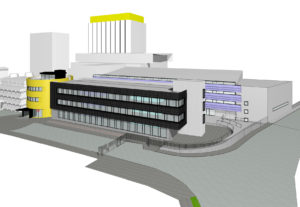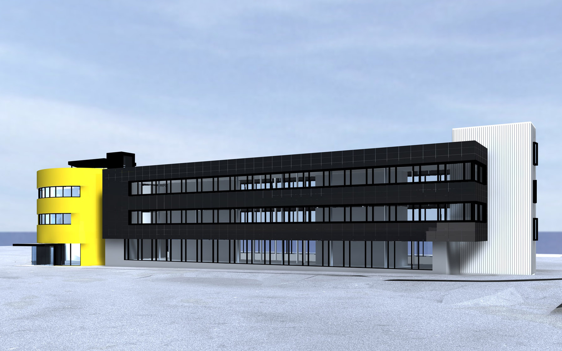 Das Projekt in Stühlingen, das sich aus zwei miteinander ver-bundenen, je viergeschossigen Gebäuden zusammensetzt, besteht aus einem Empfangsgebäude mit ellipsenförmigem Grundriss, in dem der Empfangs- und Wartebereich sowie Besprechungsräume untergebracht werden, sowie einem Bürogebäude mit dreibündigem Grundriss und Multi-Space-Bereich für bis zu 150 Mitarbeiter. Es weist eine Brutto-Grundfläche von 4218 Quadratmetern auf.