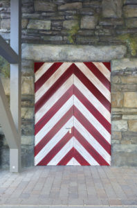 Hier sind die Türen der Blickfang: Rot-weiße Schrägstreifen auf den Türen der Technikräume im Bereich der Bushaltestelle.