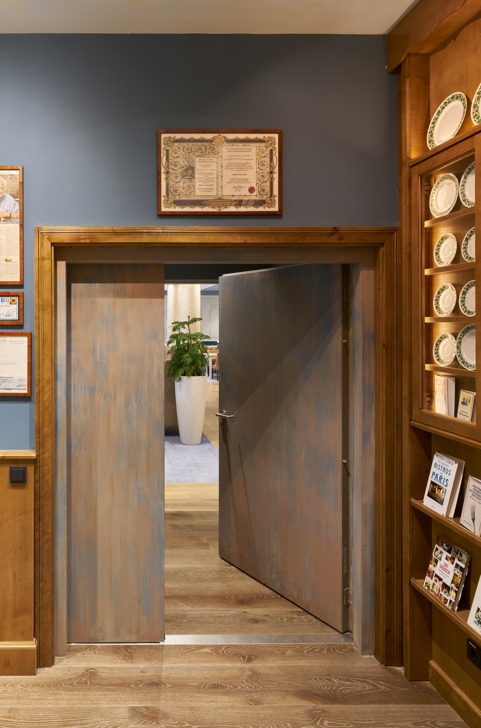 Elegant gelöst: zweiflügelige Brandschutztür T30 mit unterschiedlich breiten Türblättern und aufwändiger Bemalung, passend zum Ambiente des stilvollen Restaurants.