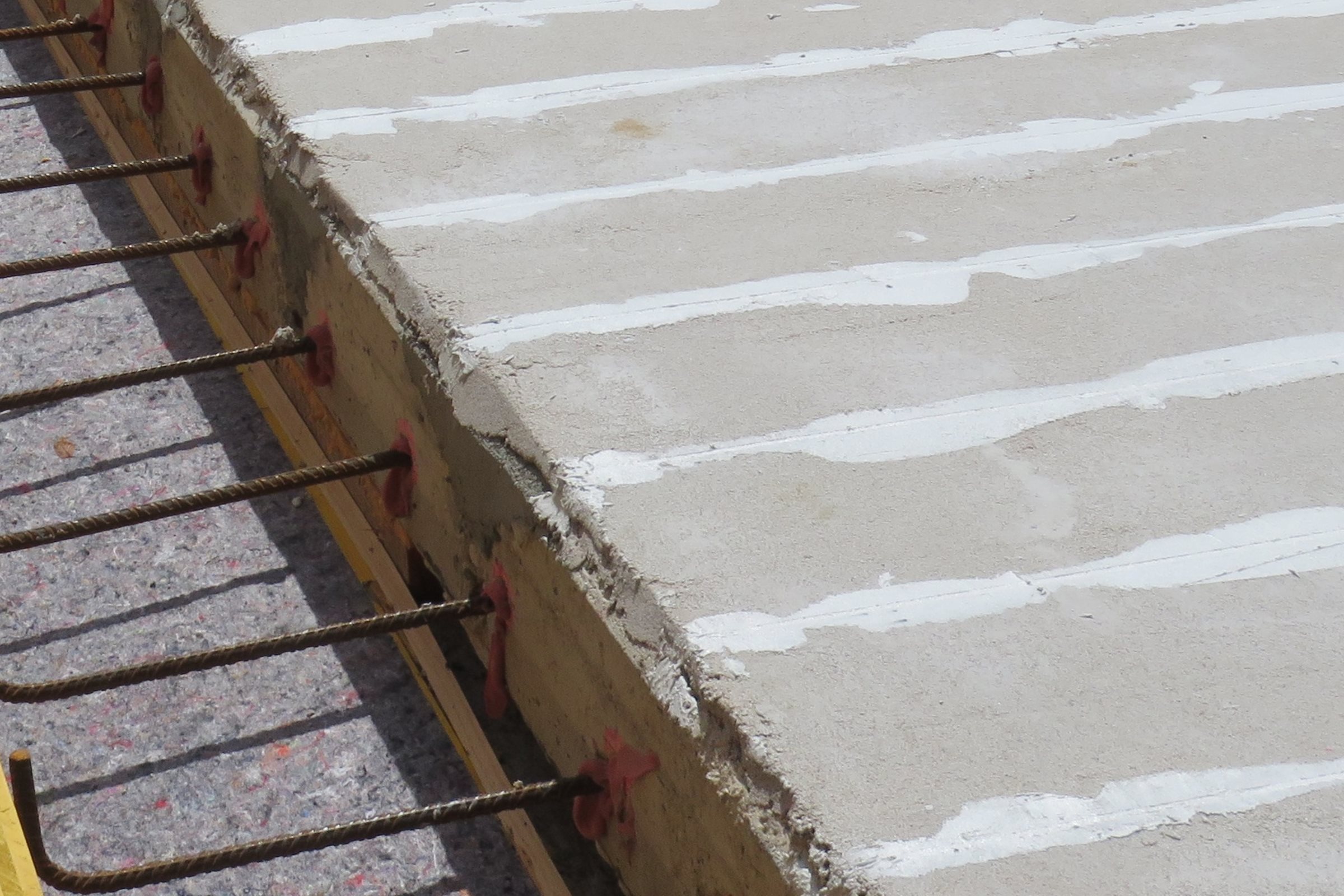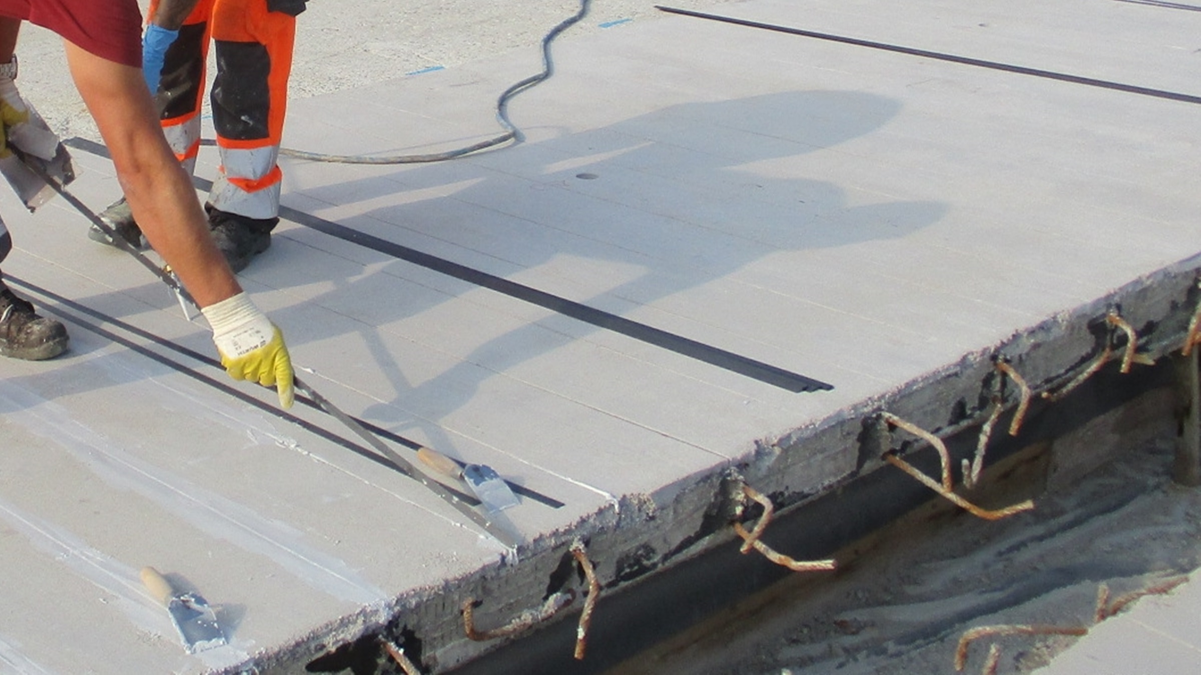 Zur Verstärkung der Kragarme entschied sich das Ingenieurbüro Garstecki für in Schlitze verklebte CFK Lamellen. Zum Einsatz kam das Verstärkungssystem „StoConcrete Carbon Plate“ von StoCretec (Kriftel). Zunächst egalisierte der beauftragte Fachverarbeiter Leonhard Weiss den vorbereiteten und mit der Haftbrücke StoPox KSH thix versehenen Untergrund mit dem epoxidharzgebundenen Mörtel StoPox Mörtel standfest. Zugleich dient der Mörtel zur Erhöhung der Betondeckung, die bereichsweise bei nur 1 bis 2 Zentimetern lag. Danach ließ er 30 Millimeter tiefe Schlitze in den Beton ein. Mit dem Epoxidharz StoPox SK 41 klebte das Team von Leonhard Weiss die CFK Lamellen anschließend in die Schlitze ein.