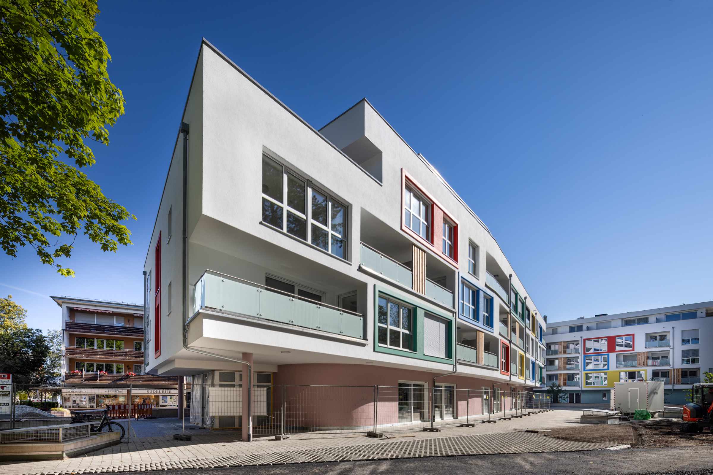 Groß, ohne zu erdrücken: Durch die aufgelockerte Kubatur und die starken Farbakzente wirken die Baukörper freundlich und einladend.