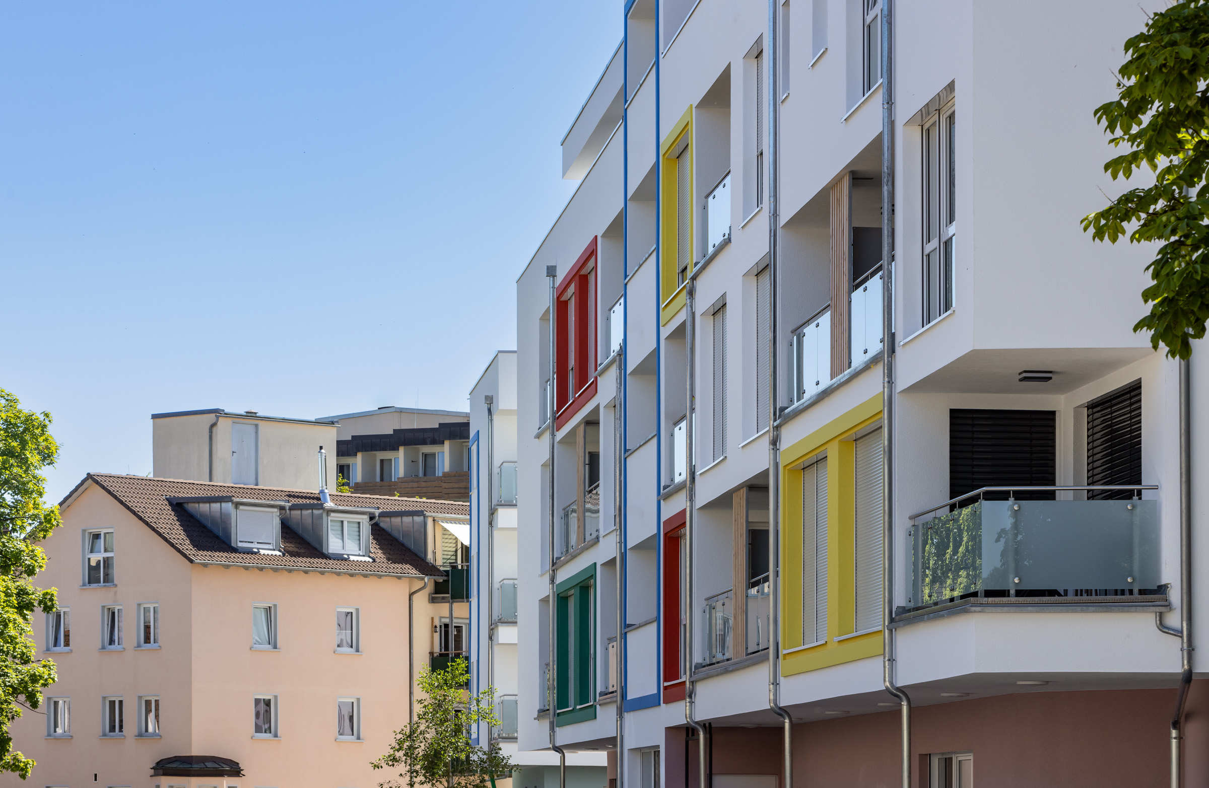 So bunt wie die Fassaden ist das Konzept des Projekts „Wohnen am Park“ in Bad Dürrheim: Bücherei, Generationentreff, Penthouses, Eigentums- und Service-Wohnungen – realisiert als KW-55-Komplex. Für den Artenschutz sind zudem 68 Nistkästen in das Dämmsystem integriert.