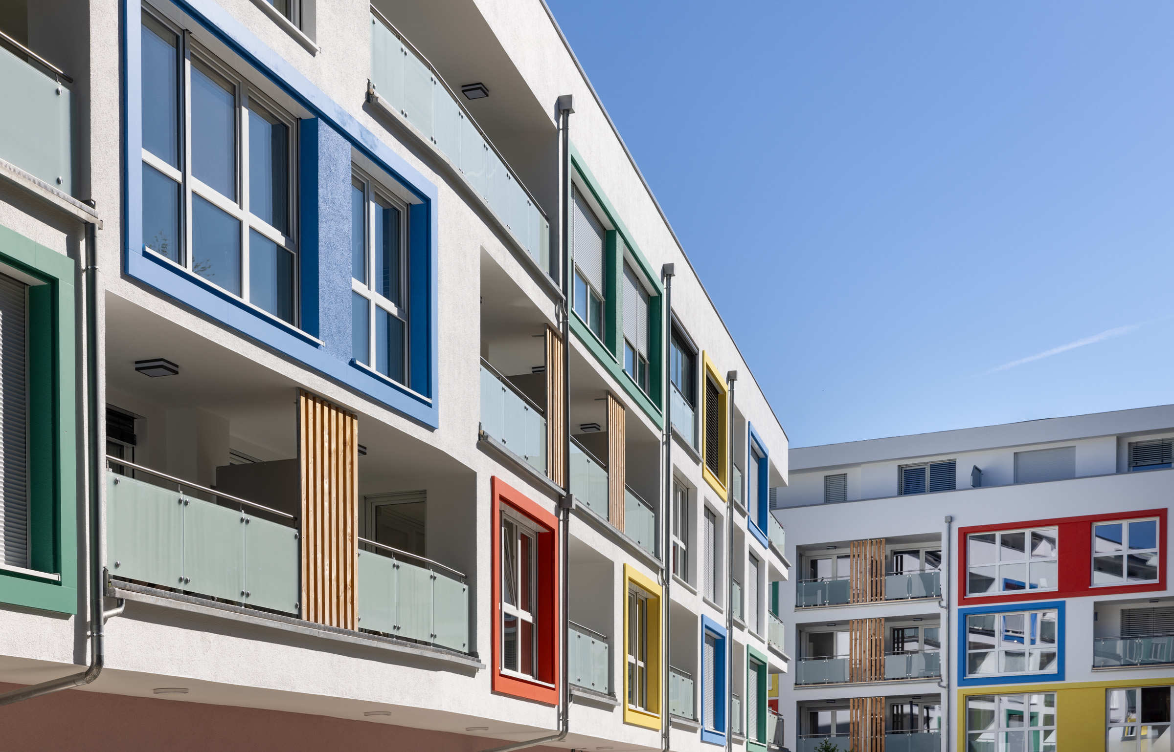 Fassadendämmsystem (StoTherm Vario), StoDeco Fassadenelemente (bunte Fensterumrandungen), StoElement Fauna-Nistkästen (für Mauersegler, Fledermäuse, Haussperlinge)