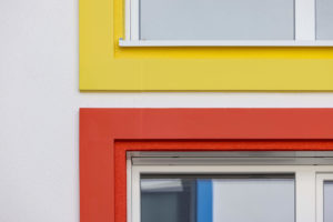 Markantes Signal nach außen ist das Farbkonzept mit kräftigen Rot-, Blau-, Grün- und Gelb-Tönen für die Fenster-Umfassungen. Die starken Farbakzente stehen im Kontrast zur gebauten Umgebung. Als besonders witterungsbeständige Lösung gestaltete der ausführende Handwerksbetrieb Kaupp aus Schramberg diese Elemente mit StoDeco Fassadenelementen.
