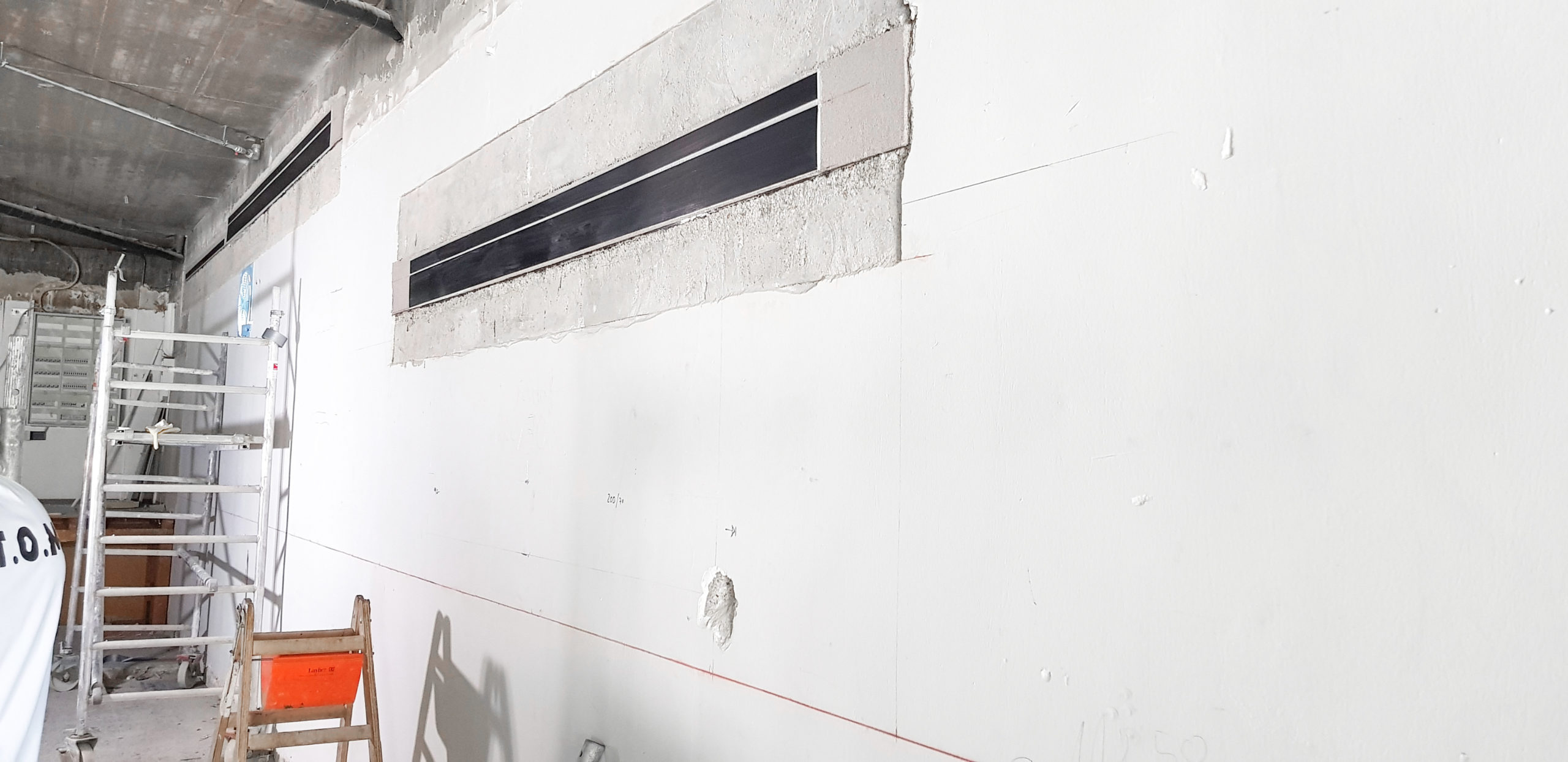 Vorbereitung der neuen Durchbrüche: Die zukünftigen Stürze sind bereits durch CFK Lamellen verstärkt. Das sichert die statische Tragfähigkeit der Außenwände, auch mit den zusätzlichen Öffnungen.