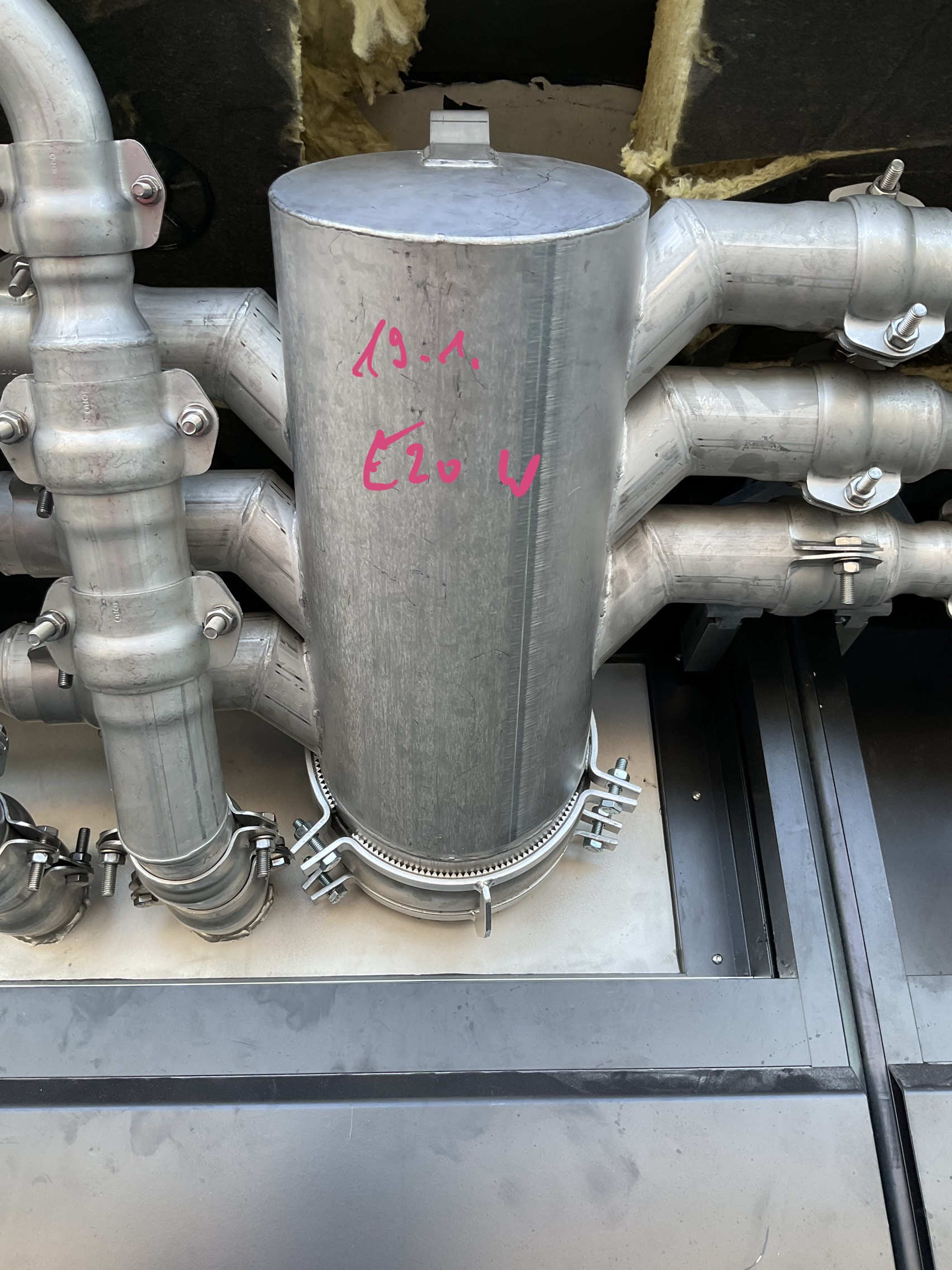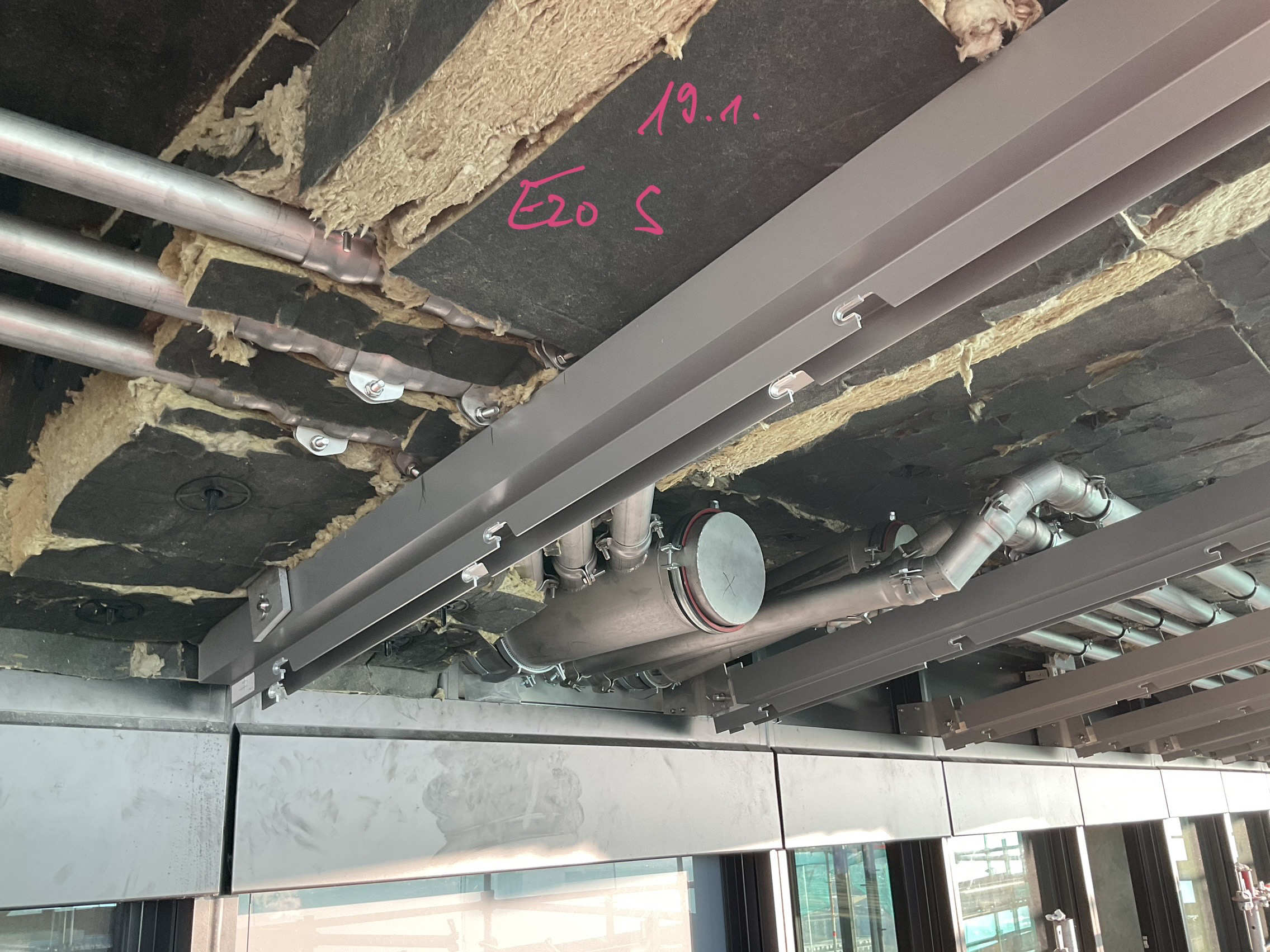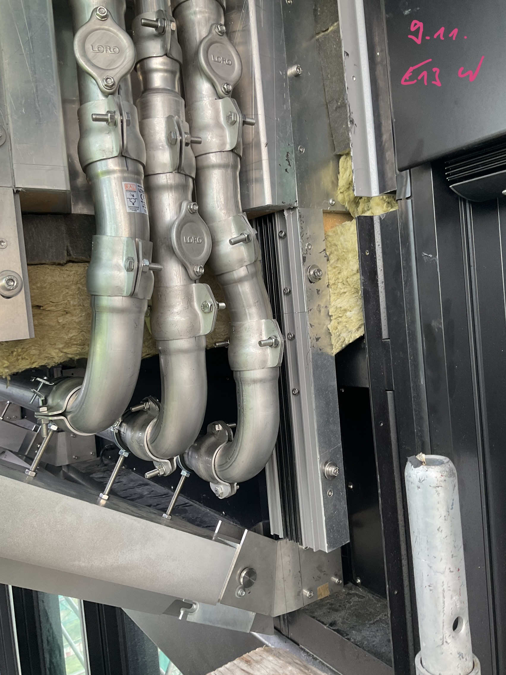 Fassaden-Entwässerung: Die einzelnen Fallleitungen laufen nach innen. Das Beispiel zeigt das Sonderbauteil, an das sechs Leitungen anschließen, von dort geht der Weg des Wassers weiter in die innenliegende Fallleitung.