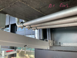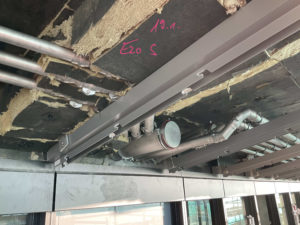 Entwässerung der Fassade. Niederschläge, die von der Fassade zu den Terrassen ablaufen, sind also gesondert abzuführen. Dafür wurden oberhalb der Terrassen kleine Abläufe (Loro-X Drainjet-Mini-Abläufe) installiert, die das Wasser von außen nach innen ableiten. Dieses System funktioniert als Unterdruck-Entwässerung. Dadurch bleiben die Abwasserleitungen – bezogen auf die Wassermenge – vergleichsweise schlank. Dennoch beeindruckt das System schon durch seine Größe: Drei sechsfach-Abzweige und acht dreifach-Abzweige mit Nennweiten DN 150 bzw. DN 200 sorgen über vier Gurte dafür, dass Niederschläge in die Kanalisation gelangen. Das System zur Entwässerung der Fassade ist unabhängig von der Terrassen-Entwässerung, die vertikalen Rohre laufen in eigenen Schächten.