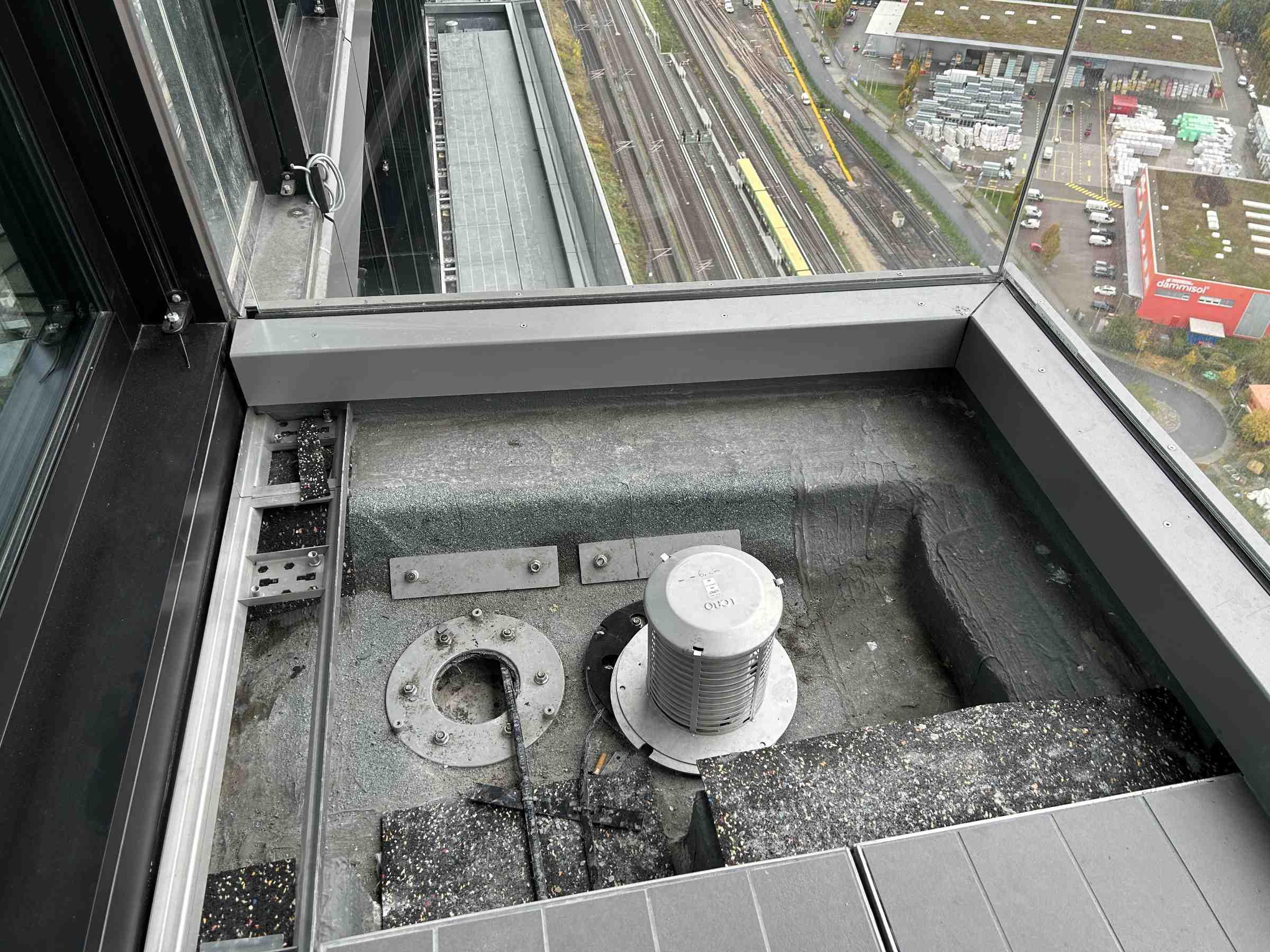 Entwässerung der Terrassen mit konventionellen Abläufen (oben) und Spezialabläufen mit Vierkantrohr. Durch die Retention ist sichergestellt, dass die Entwässerung auch bei Starkregen nicht überlastet wird. Die Niederschläge fließen von den oberen auf die darunterliegenden Terrassen, dort dann unter dem Gehbelag zu Haupt- und Not-(Retentions-)Abfluss am Ende des Balkons.