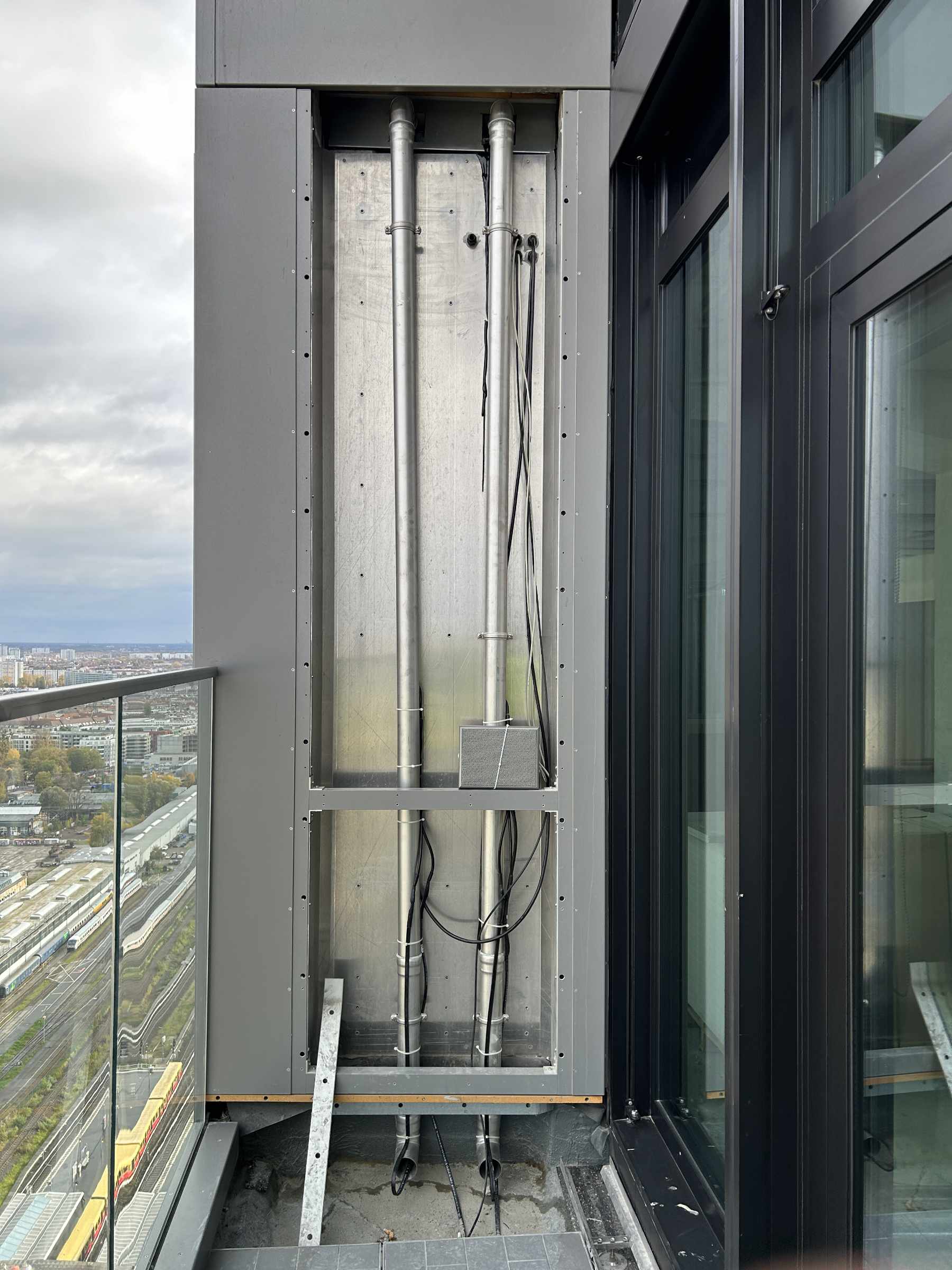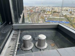 Ein Gebäude mit 140 Meter Höhe fordert eine besondere Entwässerung. Noch etwas schwieriger war es beim EDGE EastSide Tower in Berlin, dem neuen Wahrzeichen von Berlin (Architekten: BIG Bjarke Ingels Group): Hier kommen versetzt angeordneten Versprünge hinzu. Um das Wasser sicher abzuführen, entwickelte das Ingenieurbüro LESH gemeinsam mit den Spezialisten von Loro maßgeschneiderte Lösungen mit der normgerechten Auslegung der Anlage. Auf den Terrassen sorgt nun eine raumsparende, kaskadierende Entwässerung mit Retention für den zuverlässigen Abfluss – eine Sonderkonstruktion, genauso wie die Entwässerung der vertikalen Flächen, die die Terrassen frei vom Wasser der Fassade halten.