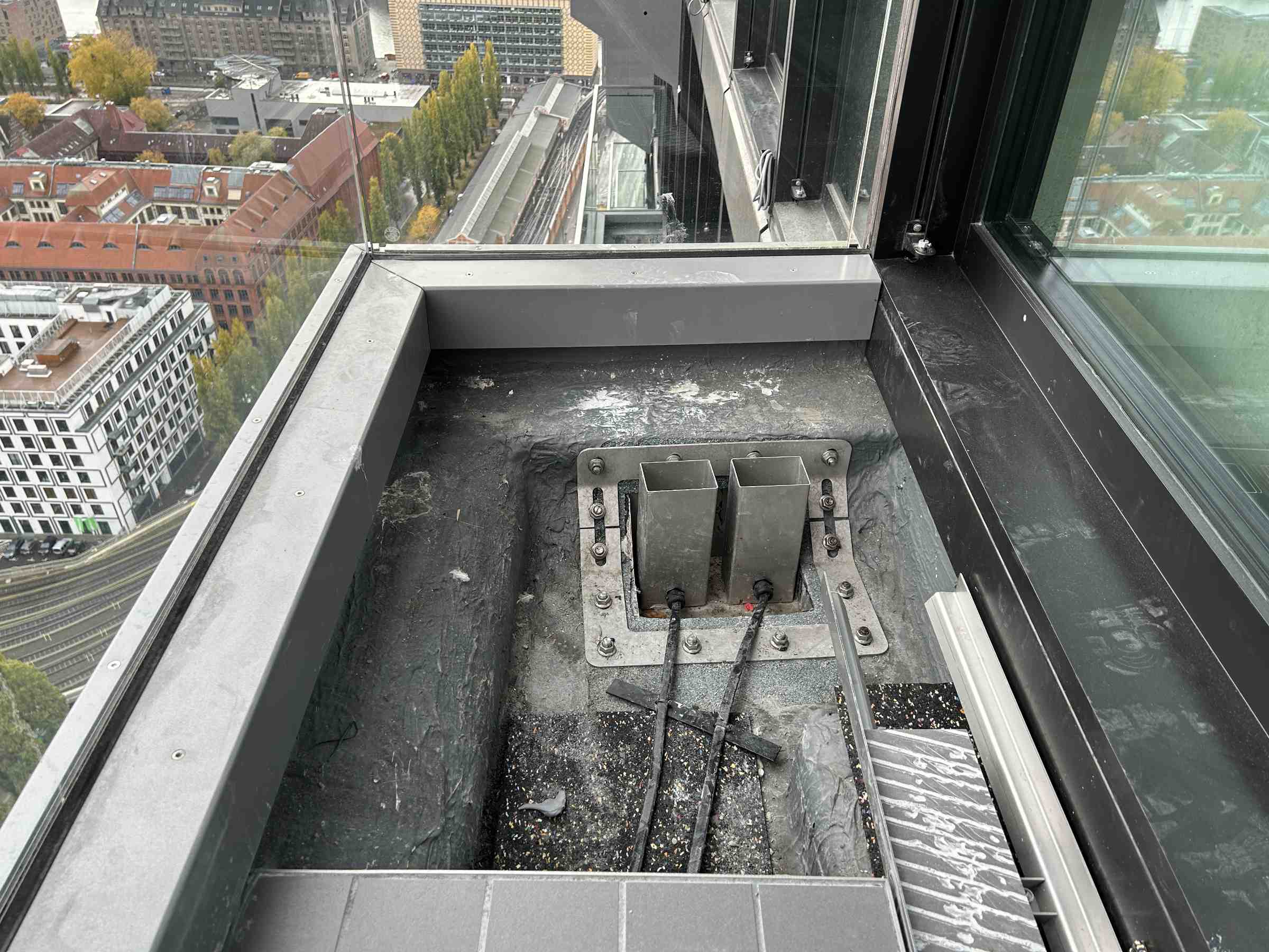 Das Bauwerk beeindruckt nicht nur als Wahrzeichen – in einem Gebäude dieser Größe steckt viel herausragende Technik im Verborgenen. Dazu zählt die Entwässerung: Niederschläge sind nicht nur vom Dach, sondern auch von den Terrassen und von der Fassade abzuführen. Hierzu entwickelten das Ingenieurbüro LESH (Haunsheim) und die Profis von Loro (Bad Gandersheim) ein ausgeklügeltes Konzept mit zwei unabhängigen Entwässerungssystemen – zusätzlich zur konventionell umgesetzten Entwässerung des Flachdachs.