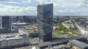 Der Neubau, von den Berlinern „Amazon-Tower“ genannt, beeindruckt durch seine ungewöhnliche Kubatur: Das 140 Meter hohe Bürogebäude, entworfen vom renommierten Büro „BIG Bjarke Ingels Group“, durchbricht den glatten, statischen Fassadenaufbau mit Einschüben und Versprüngen in der ansonsten homogenen Glasfassade. Der Philosophie des Büros entsprechend, geht die Planung über die reine Gestaltung hinaus: Das Hochhaus ist als nachhaltiges Bauwerk konzipiert und erfüllt den DGNB-Standard Platin, ebenso ist er als „Well gold“ in der Eigenschaft „Gesundheit und Wohlbefinden“ klassifiziert.
