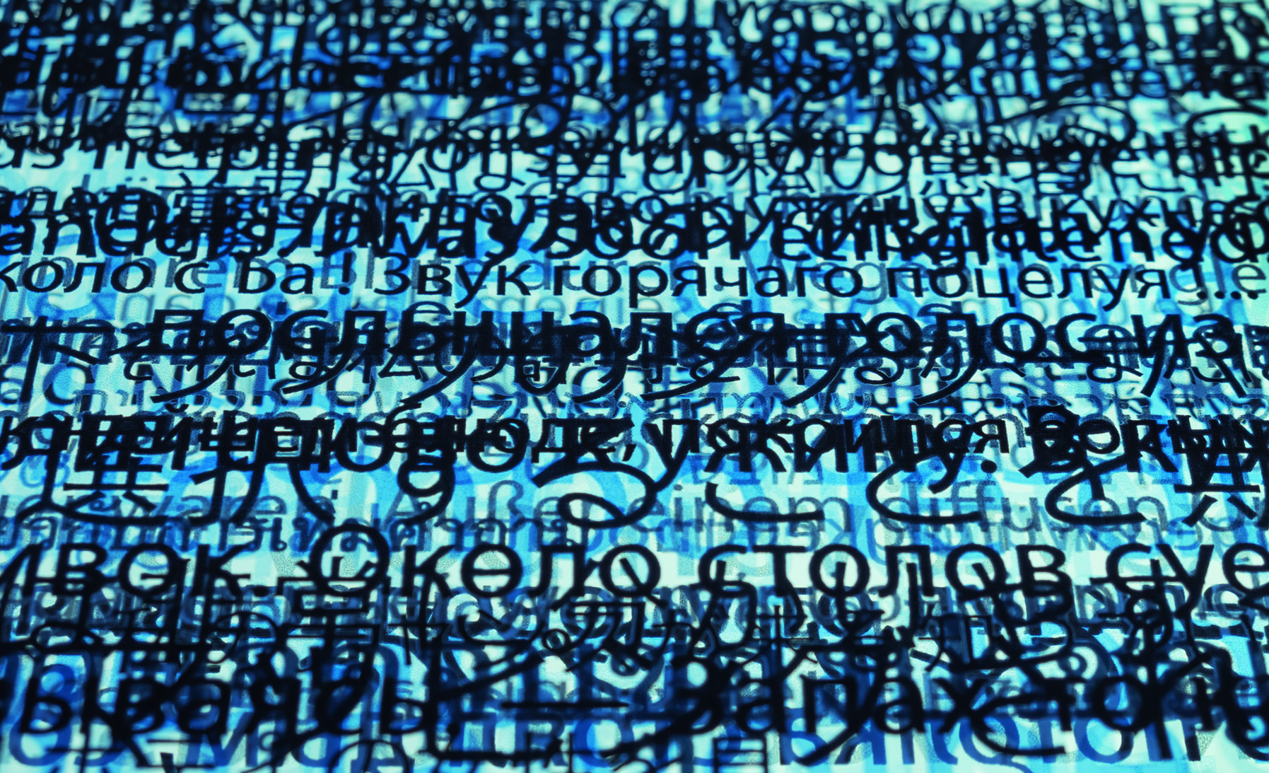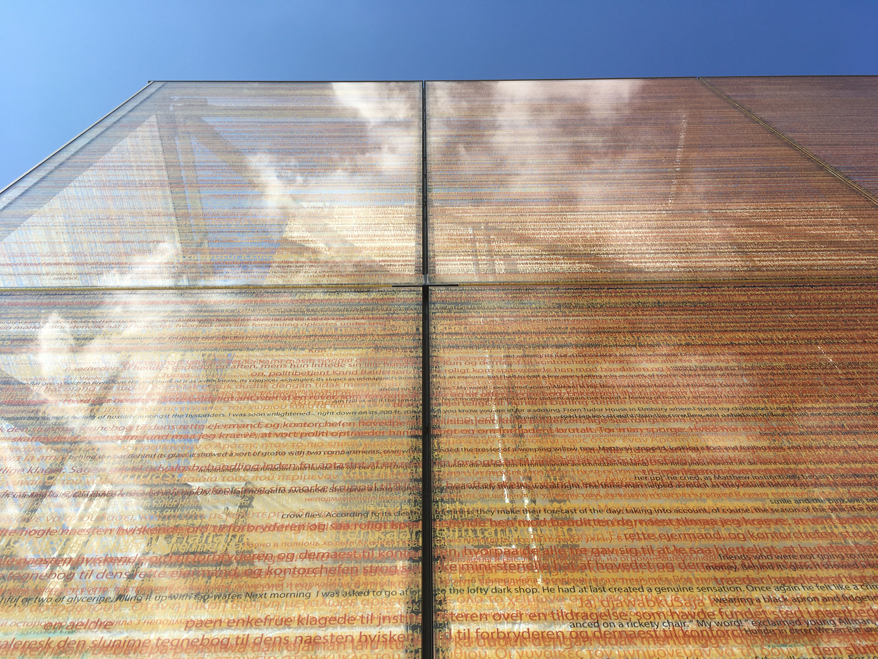 Präzisionsarbeit: Die kleinsten Buchstaben sind gerade mal sechs Millimeter groß. In dem Kunstwerk wurden Antworten auf die Frage „Was ist die Bedeutung von Wissen?“ gesammelt und in den verschiedensten Sprachen und Schriften auf das Glas gedruckt.