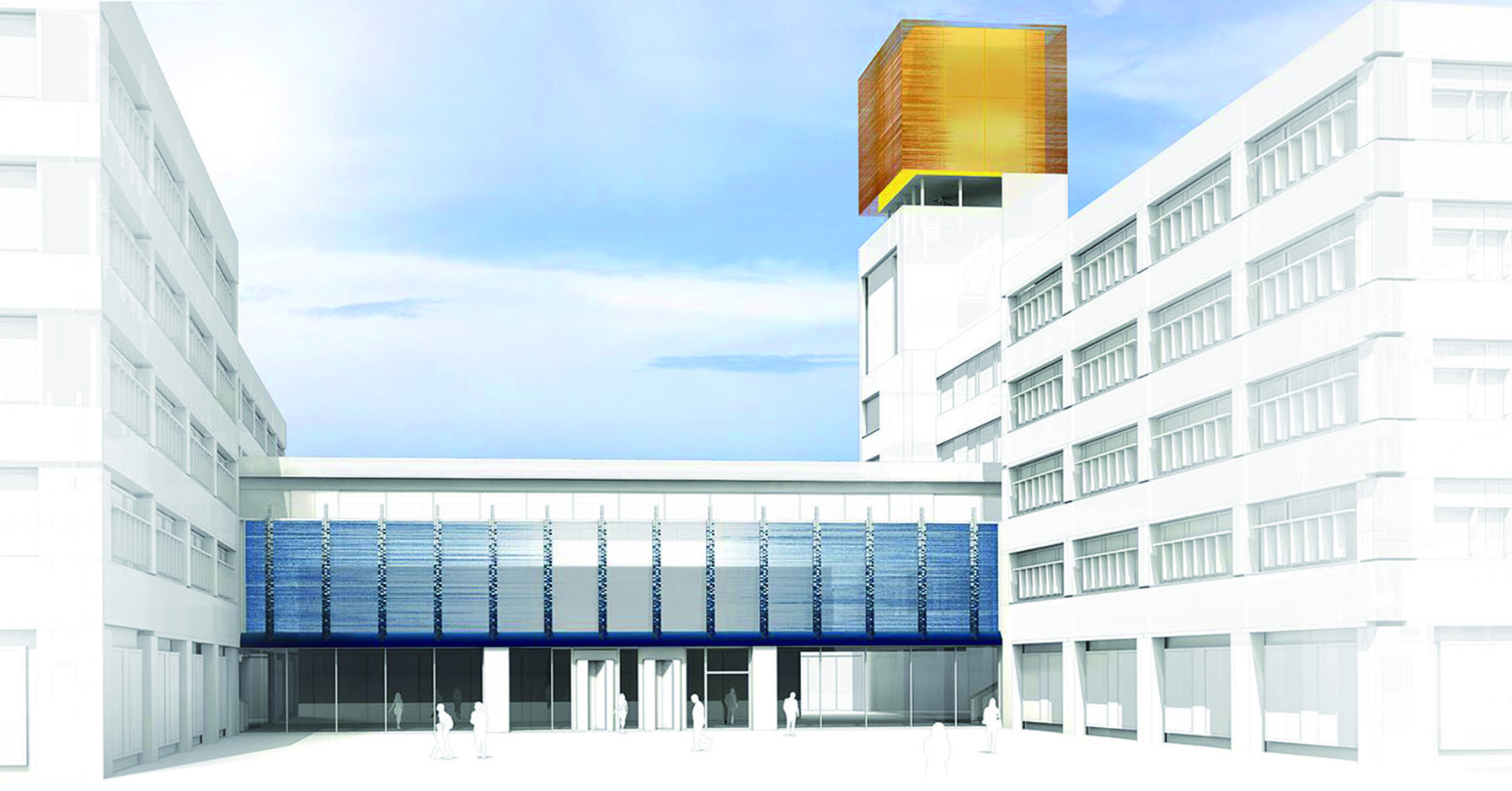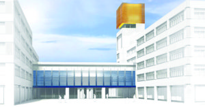 Der Neubau von Cambridge Assessment wird durch zwei prägende Baukörper und den Baustoff Glas zur Landmarke: Die hinterleuchtete Glasfassade aus orangefarbenen Laminaten setzt mit dem Turm einen weithin sichtbaren Architektur-Akzent. Isoliergläser mit blauem Druck verbinden als Skywalk zwei Trakte – und setzen einen optischen Gegenpol zum Turm.
