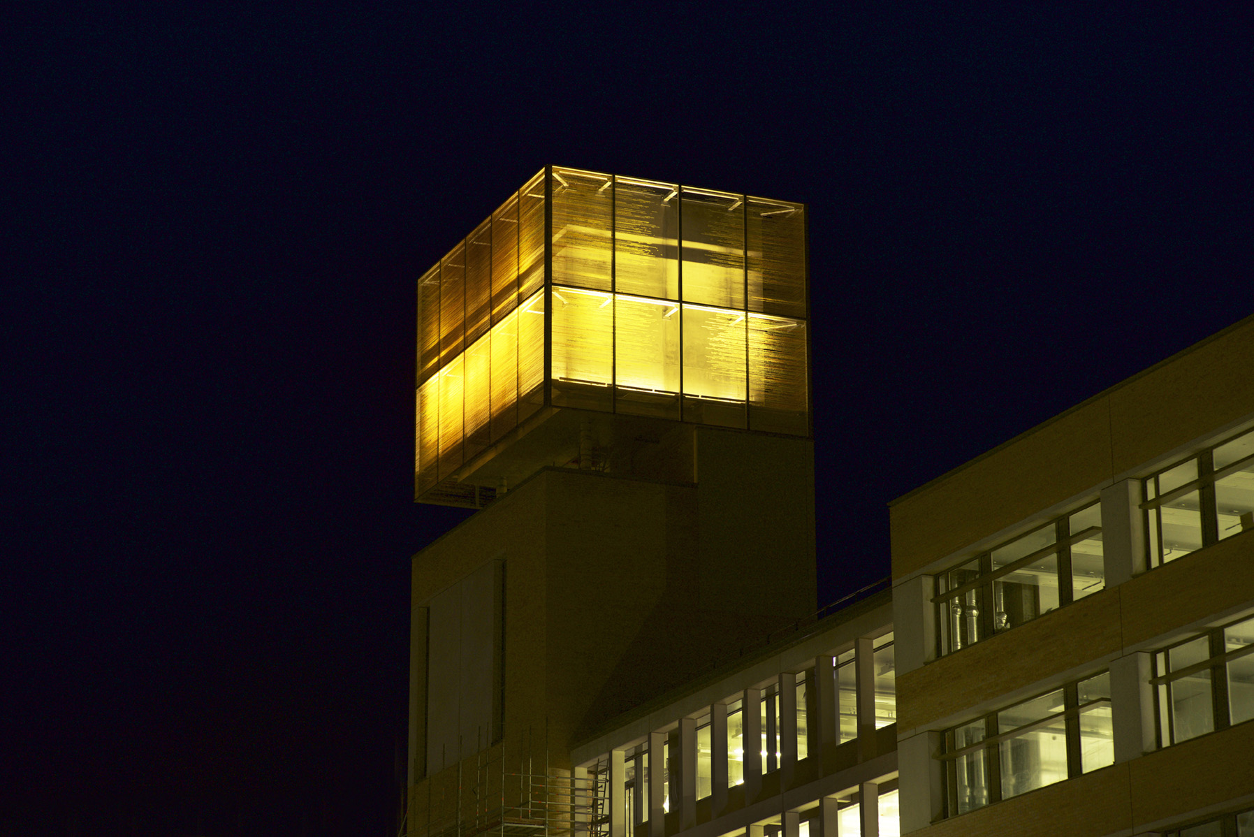 Nach Sonnenuntergang strahlen die 36 aufwändig keramisch bedruckten Laminate an der hinterleuchteten Fassade wie ein Leuchtturm in die Ferne.
