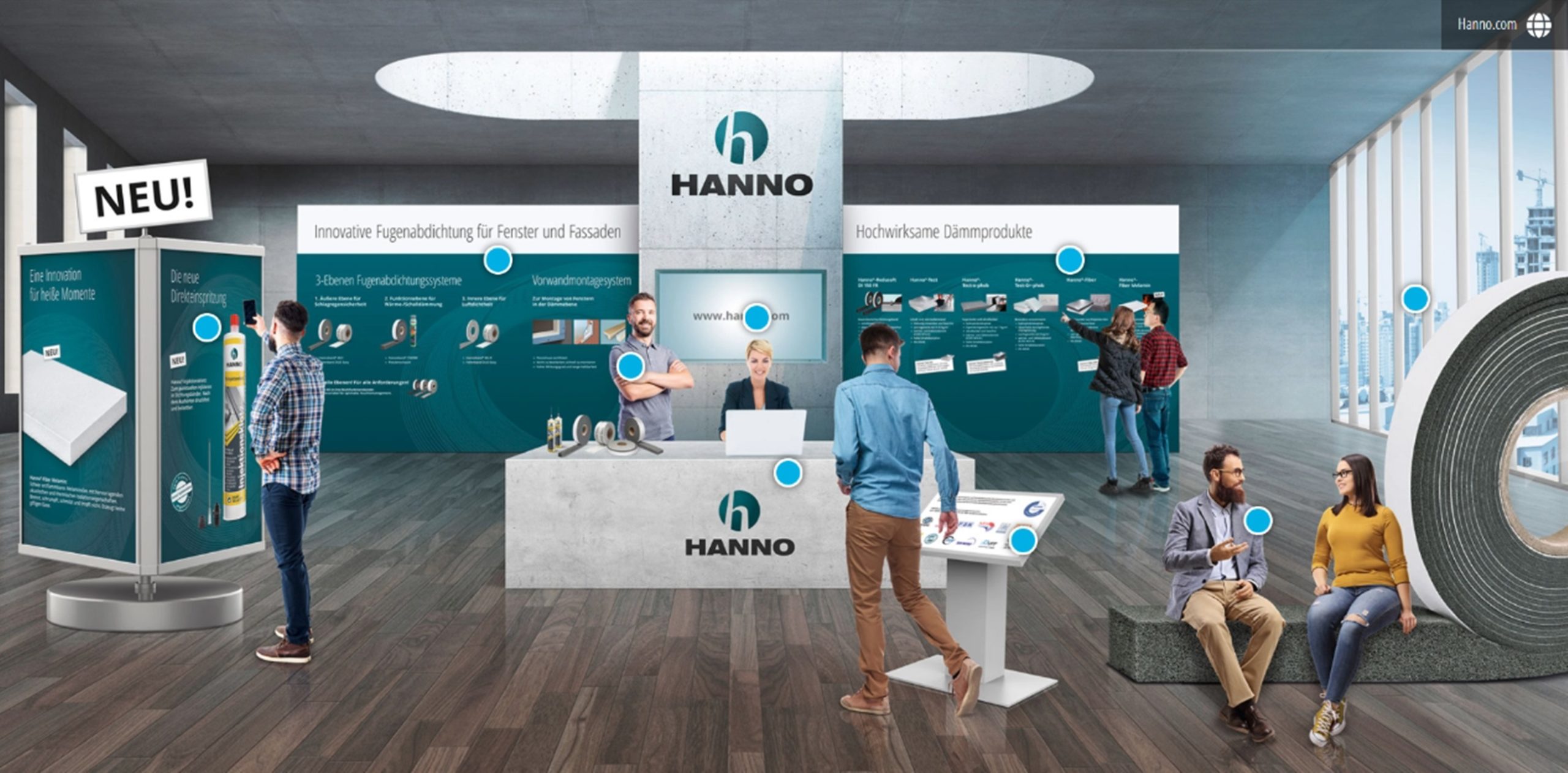 Nah, näher, digital: Auch 2021 war Hanno mit interaktivem Messestand Teil der BAU. Im modernen Design zeigte sich der Dicht- und Dämmspezialist dem Fachpublikum. Nur wenige Klicks führten Besucher zu Produkten, Referenzen und digitalen Angeboten.