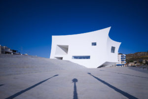 Für das Kulturgebäude in der spanischen Küstenstadt Aguilas, bestehend aus einem Konzert- und Hörsaal, konnte kein schöneres Grundstück gefunden werden. Direkt an der Mittelmeerküste gelegen, scheint seine äußere Gestalt, auf der Form eines Kubus ruhend, durch Wind und Wellen geformt zu sein. Die weiß verputzte Musikbox veranlasst Leo Modrcin zu der Annahme, „das Gebäude ist der Versuch der Architektur, fortzusegeln, ähnlich einer verklingenden Musik.“