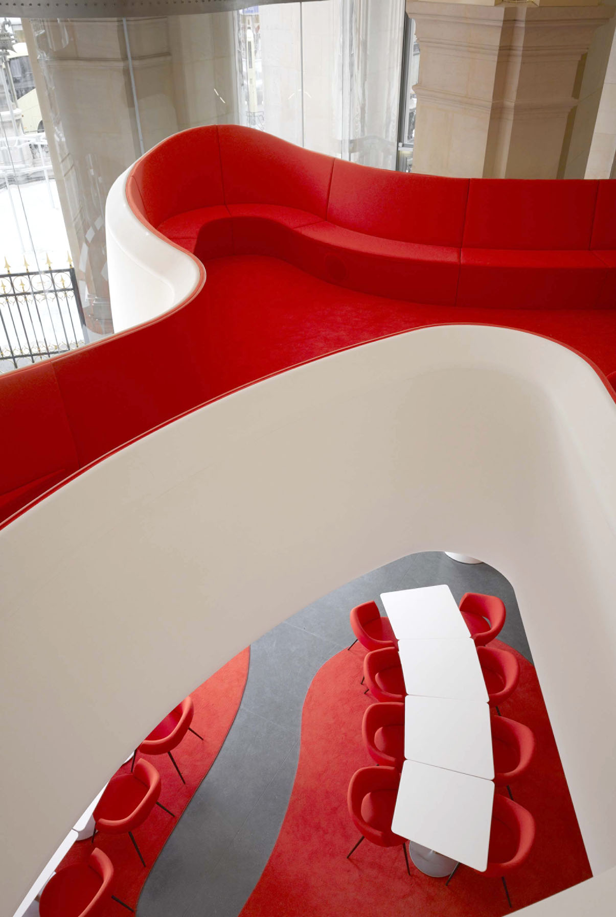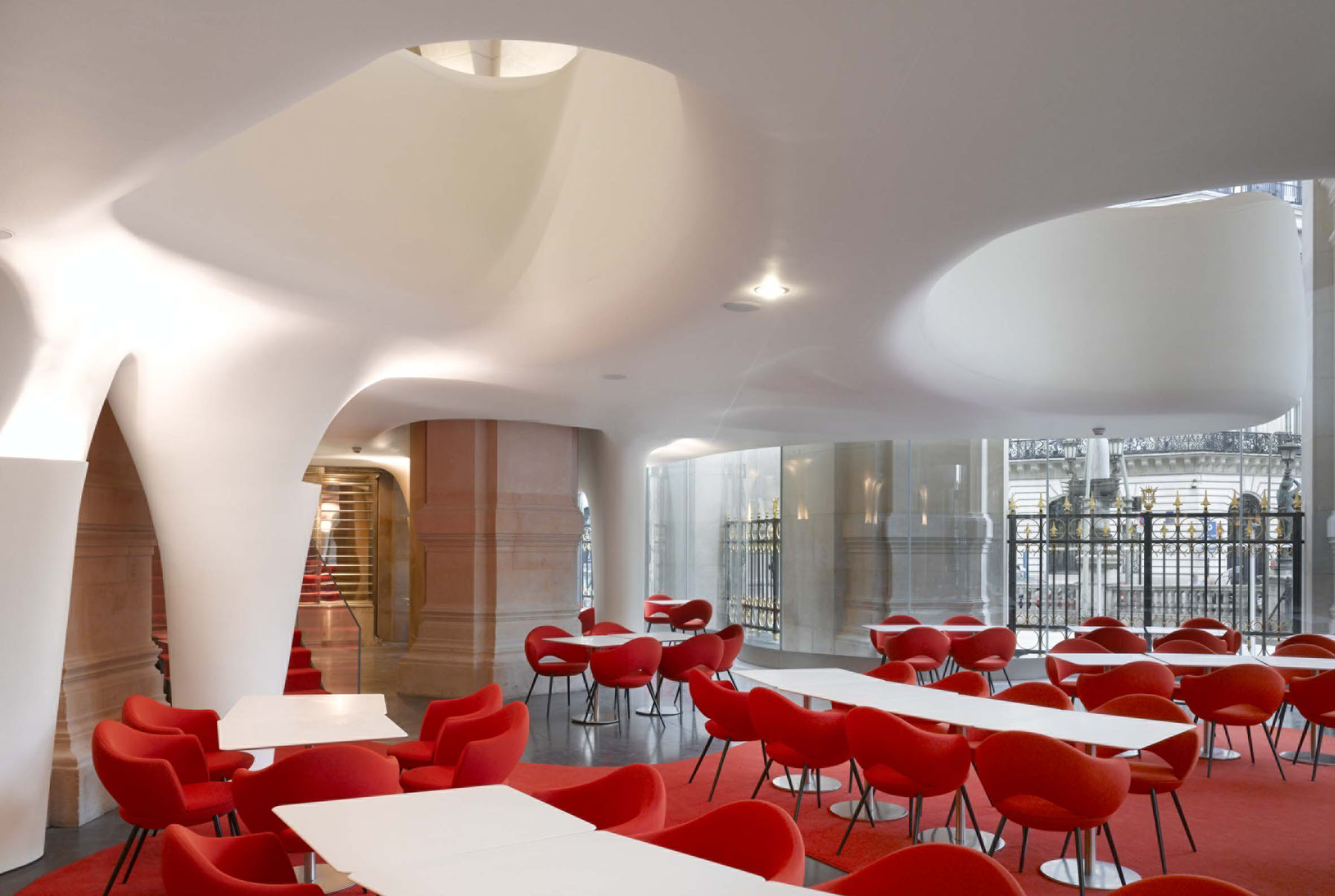 Der gewagte Einbau eines Mezzanine-Geschosses in die historische Hülle des Restaurants in der Pariser Opera Garnier hält Kjetil T. Thorsen für ein herausragendes Projekt, dessen vielschichtige Komplexität zugleich irritiert wie fasziniert: „ Ohne eine einzige Fuge wölbt sich die weiße, geformte Gipshülle des Mezzanine-Gebildes in seine Position und berührt den Boden nur punktuell über wenige schlanke Stützen. Der Raum empfängt seine Besucher in einer weichen, roten und intimen Umgebung. Diese Dualität zwischen Material und Farbe beschreibt deutlich die Beziehung zwischen esoterischen und physischen Zuständen, die für eine Oper typisch sind.“