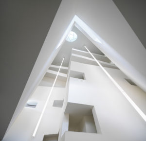 Ein Oberlicht sorgt für natürliche Belichtung, die durch die weißen Wände verstärkt und durch bewusst platzierte Öffnungen in die umliegenden Räume gebracht wird, wobei die Lichtintensität allmählich abnimmt. Für die kontrollierte Beleuchtung der verschiedenen Ausstellungsräume werden Röhrenleuchten verwendet. Insgesamt dominiert ein gleichmäßiges und diffuses Licht, das der geometrischen Form des Raums einen vielschichtigen, lebendigen und starken Ausdruck verleiht.