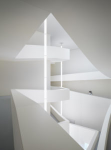 Im Gegensatz zur dunklen Außenhaut ist der Innenraum ganz in Weiß gehalten. Entlang der längsten Seite des Grundrisses reihen sich die Treppen, Aufzüge, Lager und Sanitärräume. Im mittleren Teil sind die Ausstellungsräume untergebracht. Im südöstlichen Zipfel der Dreiecksform erstreckt sich ein fließender Freiraum vom ersten bis zum vierten Stockwerk, der von Rampen umgeben ist, über die die Besucher in die einzelnen Ausstellungsebenen gelangen und verschiedene räumliche Perspektiven erleben.