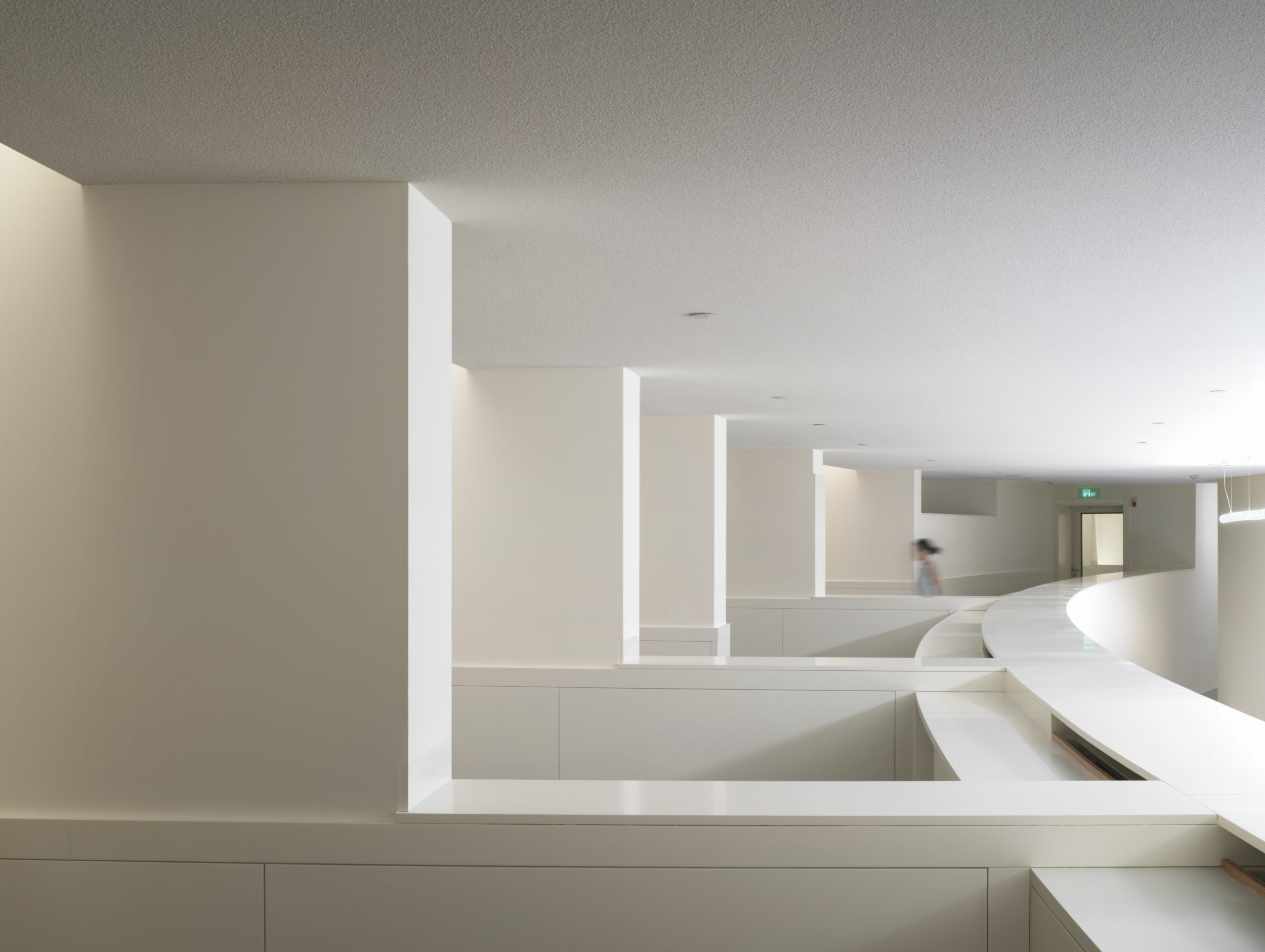 Im Gegensatz zur dunklen Gebäudehülle ist das Innere des Museums, inklusive der fugenlosen Akustikdecken, ganz in Weiß gehalten.