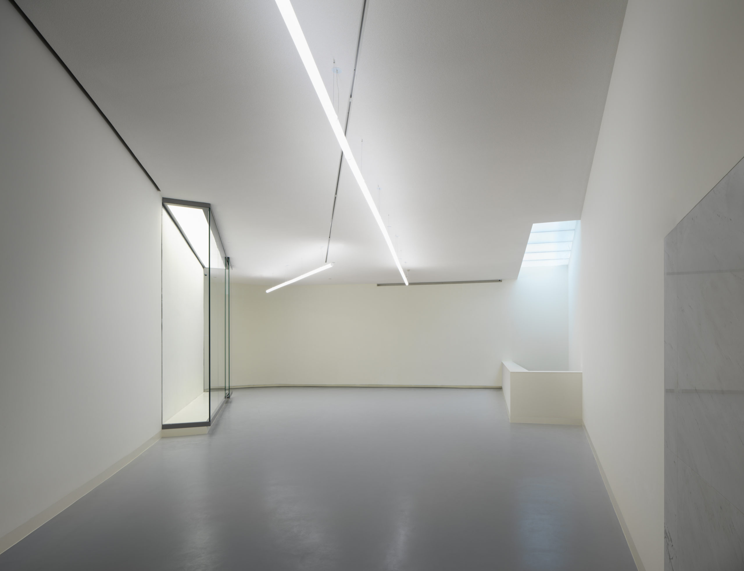 Ein Oberlicht sorgt für natürliche Belichtung, die durch die weißen Wände verstärkt und durch bewusst platzierte Öffnungen in die umliegenden Räume gebracht wird, wobei die Lichtintensität allmählich abnimmt. Für die kontrollierte Beleuchtung der verschiedenen Ausstellungsräume werden Röhrenleuchten verwendet. Insgesamt dominiert ein gleichmäßiges und diffuses Licht, das der geometrischen Form des Raums einen vielschichtigen, lebendigen und starken Ausdruck verleiht.