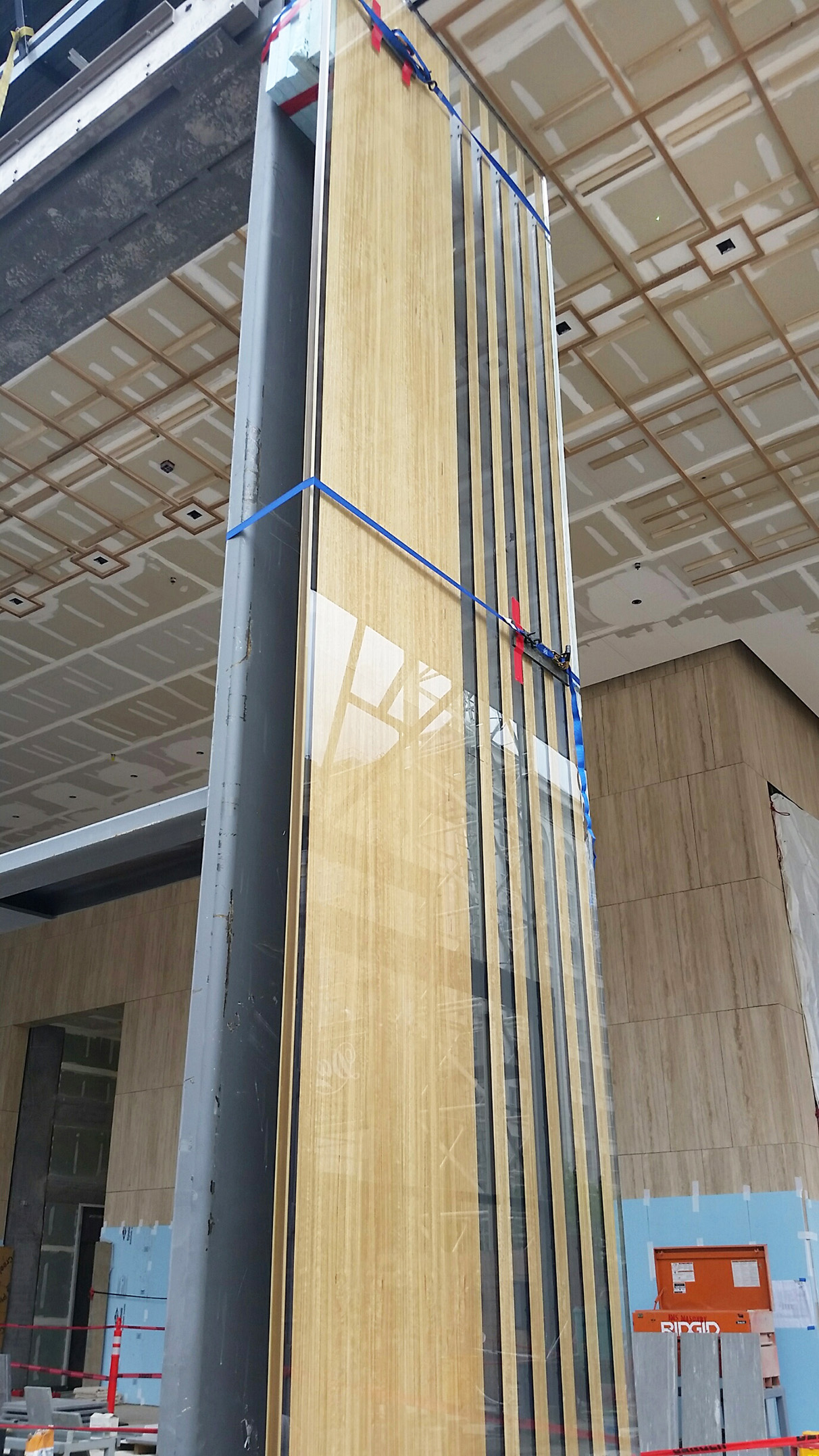 Edle Holzbauteile, die auf sieben Meter Höhe in Glaselemente übergehen – die Planer vom SOM-Büro in San Francisco hatten eine klare Vision für die Lobby des neuen Büro-Hochhauses im Zentrum von Salt Lake City. Nur: So etwas wurde noch nie zuvor realisiert. Die erste Idee, diese Optik mit einem fotorealistischen Druck umzusetzen, wurde schnell verworfen – es wirkte den Architekten nicht real genug. Der Lösungsansatz lautete daher: Lamination von Echtholzfurnieren in den Glasaufbau. Das wiederum klang schon fast nach einer „Herkulesaufgabe“– einen natürlichen, organischen Stoff in ein Fassadenglas zu integrieren, ohne dass er im Produktionsprozess (unter anderem im Ofen!) Schaden nimmt und maßhaltig seine Optik behält. Mit viel Erfahrung und Know-how in der Laminationstechnik und enger Abstimmung der Beteiligten fanden die Spezialisten von sedak dennoch den Weg, die Vision zu realisieren.