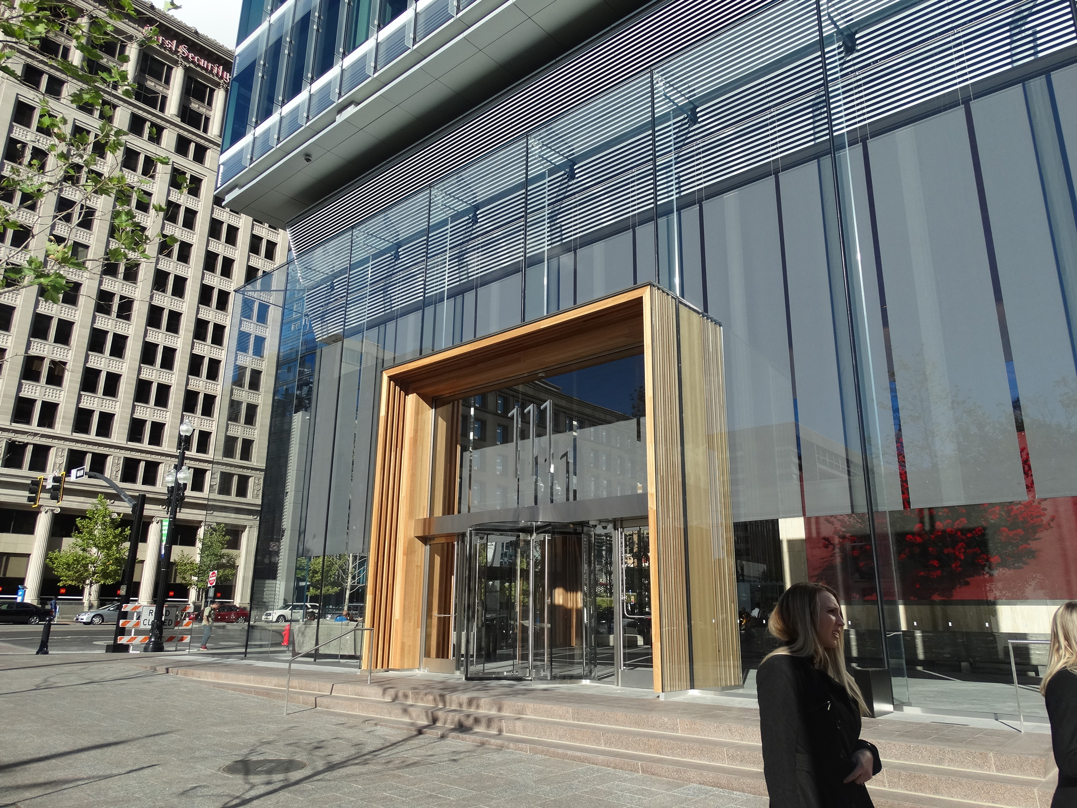 Glas und Holz bestimmen das Bild der gesamten Lobby. „Die Inspiration für die transparente Fassade fand der Kunde bei dem „Apple Cube“ – ein vollkommen aus Glas gefertigter Kubus“, so Maic Pannwitz, Executive Vice President von sedak in New Jersey. „Daher war beim Projekt „111 South Main Street“ auch eine transparente Tragstruktur gefordert“.