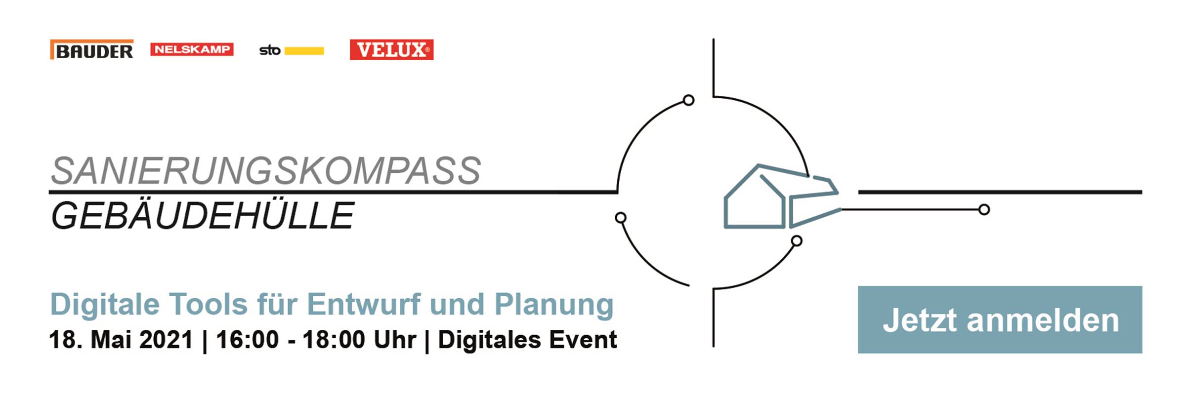 Am 18. Mai von 16 bis 18 Uhr informiert ein Webinar Architektinnen und Architekten über sechs digitale Instrumente für Entwurf und Planung. Die kostenfreie Veranstaltung ist Teil der Reihe „Sanierungskompass Gebäudehülle“, organisiert von Bauder, Nelskamp, Sto und Velux. Die Anerkennung als Fortbildungsveranstaltung bei den Architektenkammern ist beantragt.