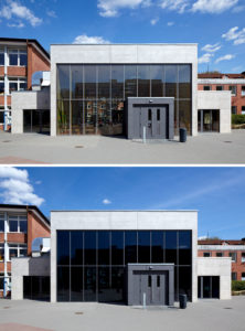 In der großflächigen und nach Süden ausgerichteten Fassade der Mensa verbaute Holzbau Gehrmann (Hoisdorf) 52 Quadratmeter des dimmbaren Sonnenschutzglases – insgesamt siebzehn Panels. Die Sicherheitstüren auf beiden Seiten des Kubus sind ebenfalls mit ECONTROL ausgestattet. Für deren Einbau zeichnen die Metallbauer von Pahlaß & Preuß Metallbau (Eldena) verantwortlich. Thomas Groneick (EControl-Glas) erläutert: „Unser Glas erfüllt in der Fassade und den Türen der Mensa eine Vielzahl von Ansprüchen. Sonnenschutz, Wärmeschutz, Blendschutz, Sicherheit – bei stets freier Durchsicht. Mehr Flexibilität geht nicht.“