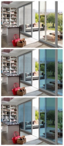 Mit dimmbarem Glas von EControl werden Licht und solarer Energieeintrag regelbar: Im Bild: Ungedimmt (oben), 50 Prozent und 100 Prozent Dimmung (mittig), zweimal 100 Prozent (unten). Das Glas eignet sich gleichermaßen für Fenster, Fassaden, Dachverglasungen und Wintergärten.