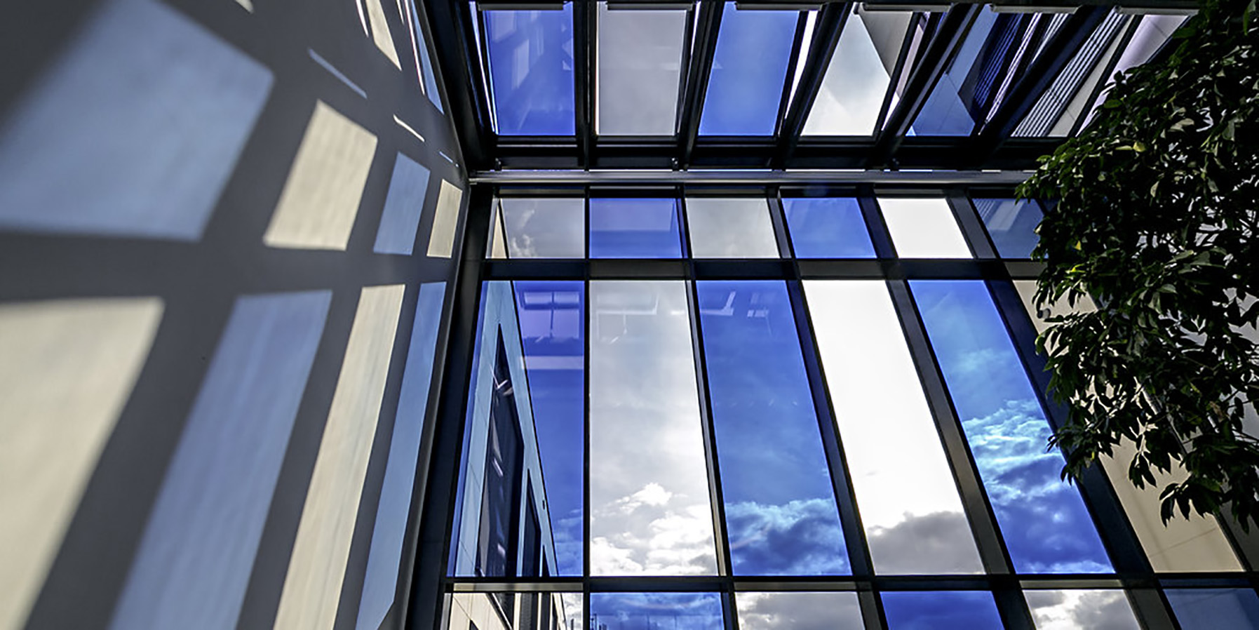 Innenansicht des Atriums. Das dimmbare Glas ECONTROL lässt sich jedem Bedürfnis anpassen und individuell steuern. Die innenliegende Nanostrukturbeschichtung von ECONTROL erzeugt den so genannten „elektrochromen Effekt“ über eine elektrische Spannung und färbt das Glas blau ein.