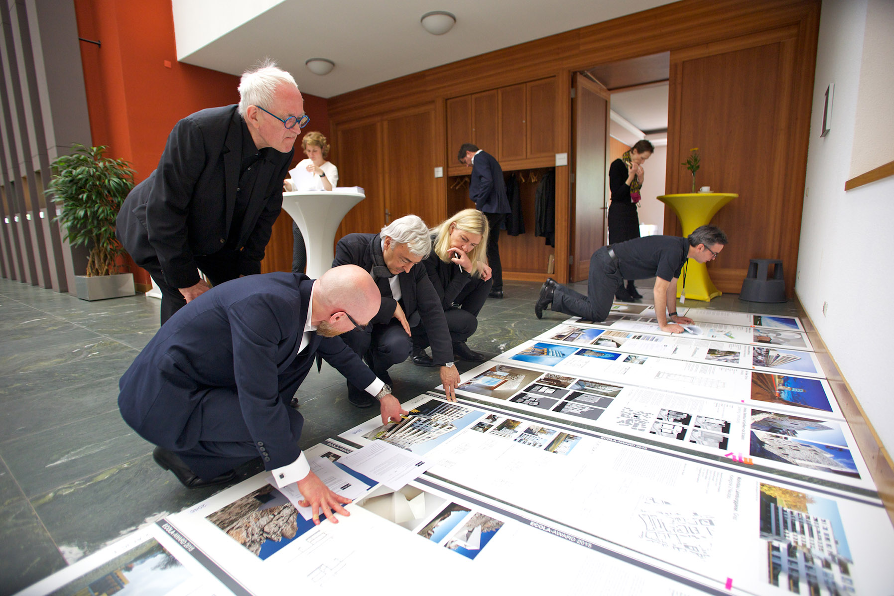 Der große Lichthof in der von Hans Kollhoff 1997 ausgebauten Berliner Niederlassung der Sto SE & Co. KGaA eignete sich hervorragend für die Jurysitzung am 8. Mai 2015. Die Jury setzte sich wie folgt zusammen: Sir Peter Cook, London, UK (Jury-Vorsitzender); Brian Cody, Graz, AT; Hubert Klumpner, Zürich, CH; Dorte Mandrup, Kopenhagen, DK; Enrique Sobejano, Madrid, ES.