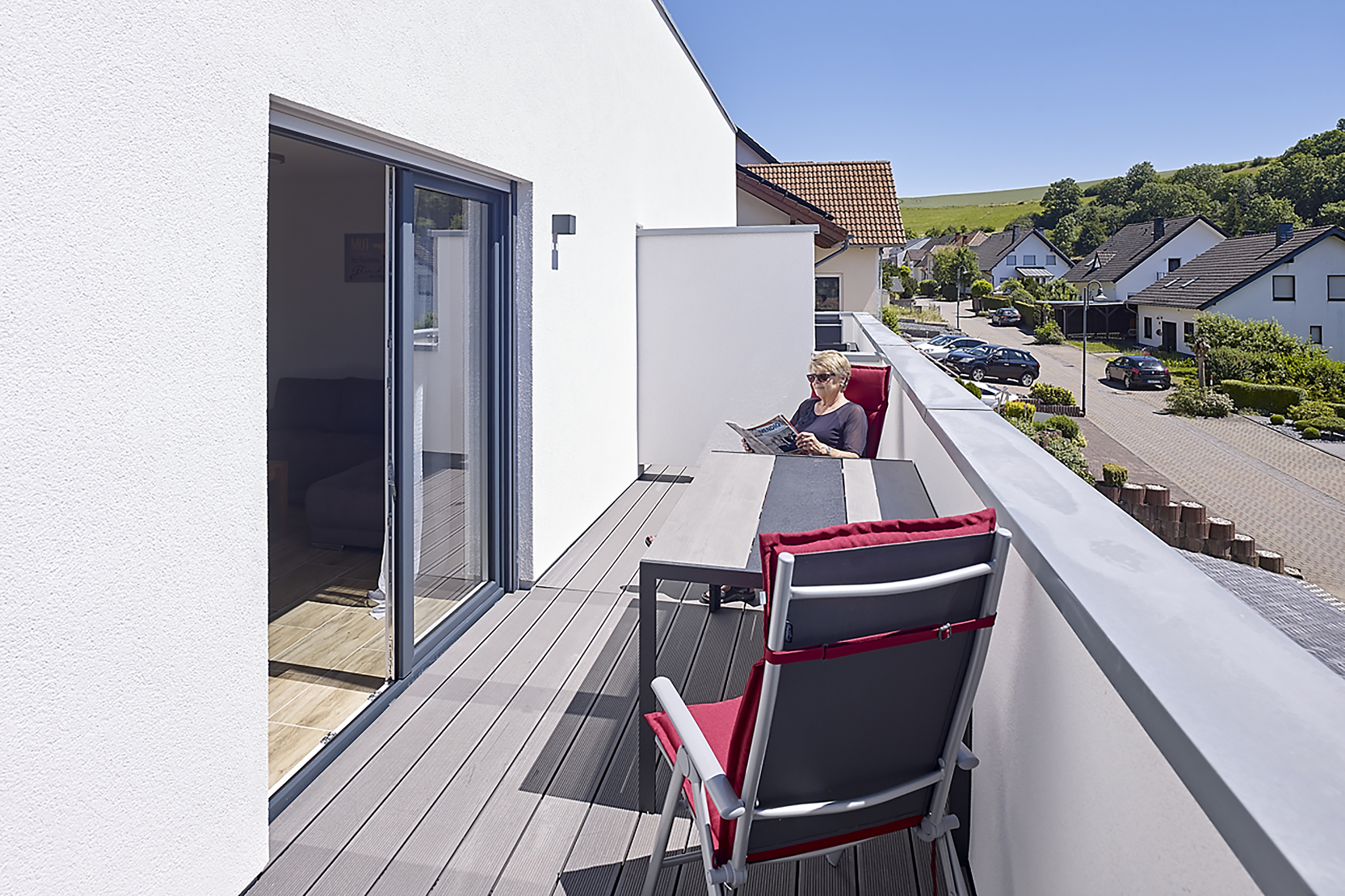 Ein Familienprojekt der besonderen Art: Zwischen Wacholderheiden und verzweigten Wanderpfaden plante und realisierte Familie Müller aus Volkesfeld den Bau eines Appartement-Hauses mit Penthouse. Nun laden die Ferienwohnungen mit großem Balkon zum Urlaub in der Natur ein. Beim Bau setzte die Familie auf Eigenleistung – und war beim Innenausbau von einer Bauplatte aus Recycling-Glas begeistert, die sich besonders leicht verarbeiten lässt und gute ökologische Eigenschaften bietet.
