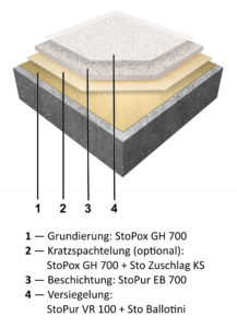 Die dickschichtige Polyurethanharz-Beschichtung StoPur EB 700 ist kälteelastisch und hoch rissüberbrückend. Sie schützt Balkone und Laubengänge vor Stoffen, die den Beton schädigen könnten. Das zweikomponentige Harz erfüllt die Emissionsklasse M1 und trägt so zu mehr Wohngesundheit und Umweltschutz bei. Es ist hoch beständig gegen UV-Strahlen und Witterung. Mit einem breiten Farbtonspektrum bietet die Beschichtung zudem viel Spielraum für attraktive Gestaltung.